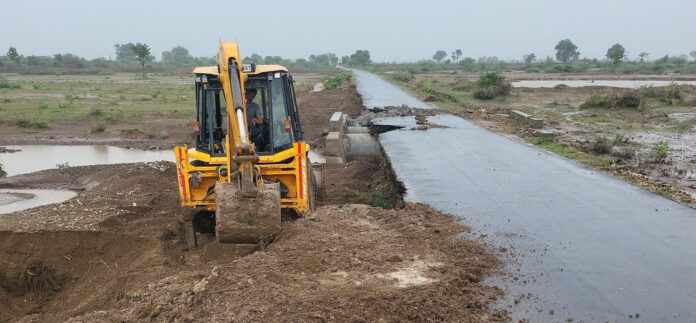 ભારે વરસાદથી અમરેલી તાલુકાનો રંગપુર સણોસરા માર્ગ અસરગ્રસ્ત બન્યો હતો. પાણીના તીવ્ર પ્રવાહથી આ રસ્તાની બન્ને બાજુએ વધુ માત્રામાં ધોવાણ થયું હતું. અમરેલી જિલ્લા માર્ગ અને મકાન પંચાયત વિભાગ હેઠળના આ રસ્તાનું મરામત કાર્ય અમરેલી જિલ્લા માર્ગ અને મકાન પંચાયત તંત્ર દ્વારા ત્વરાભેર પૂર્ણ કરવામાં આવ્યું હતું. જેસીબી મશીનની મદદથી આ માર્ગનું જરુરી મરામત કાર્ય પૂર્ણ કરવામાં આવ્યું હતું. રસ્તાનું વધારે ધોવાણ ન થાય તે માટે માર્ગ મરામત માટેની આવશ્યકતા મુજબ પથ્થર અને રેતી – સિમેન્ટના મિશ્રણના ઉપયોગ થકી રસ્તાના સમારકામની કામગીરી અમરેલી જિલ્લા માર્ગ અને મકાન પંચાયત તંત્ર દ્વારા કરવામાં આવી હતી.