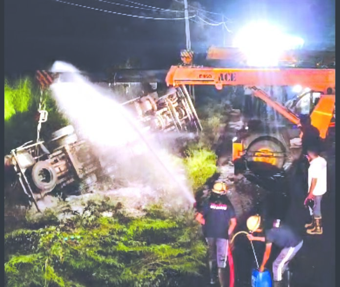 ગઈકાલે અમરેલી ફાયર કંટ્રોલ રૂમને જાણ થઈ હતી કે જામનગરથી રાજુલા જતા ડીઝલ ટેન્કર લાઠી તાલુકાના ચાવંડ નજીક પલટી મારી ગયું છે. ઇન્ચાર્જ ફાયર ઓફિસર એચ.પી. સરતેજાની આગેવાની હેઠળ અમરેલી ફાયર એન્ડ ઇમર્જન્સી સર્વિસની ટીમ તાત્કાલિક ઘટનાસ્થળે પહોંચી સતત ફોમનો મારો ચલાવી પરિસ્થિતિ કાબુમાં લીધી. બાદમાં ક્રેનની મદદથી ટેન્કરને ઊભું કરી માર્ગ પરથી હટાવવામાં આવ્યું હતુ. ઘટનામાં કોઈ જાનહાની થઈ નથી. આ કામગીરીમાં આનંદભાઈ જાની, કૃષ્ણભાઈ ઓળકિયા, અરૂણભાઈ વાઘેલા અને ધવલભાઈ ચાવડા જોડાયા હતા.