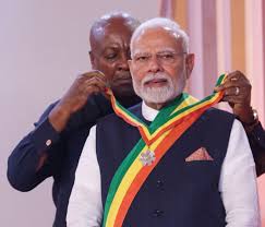 ઘાનાના રાષ્ટ્રપતિ જાન ડ્રામાની મહામાએ પ્રધાનમંત્રી નરેન્દ્ર મોદીને તેમના દેશના સર્વોચ્ચ પુરસ્કાર ‘ઓર્ડર ઓફ ધ સ્ટાર ઓફ ઘાના’ થી સન્માનિત કર્યા. આ સાથે, પ્રધાનમંત્રીને મળેલા આંતરરાષ્ટ્રીય પુરસ્કારોની સંખ્યા ૨ ડઝનને વટાવી ગઈ છે. આ મહાન સન્માન પ્રાપ્ત થયા પછી, પીએમ મોદીએ ઘાના પ્રત્યે કૃતજ્ઞતા વ્યક્ત કરી અને તેને દેશના ૧.૨૫ અબજ નાગરિકોને સમર્પિત કર્યું. આ સમય દરમિયાન, ભારત અને ઘાના વચ્ચે દ્વિપક્ષીય વાતચીત પછી, ૪ મહત્વપૂર્ણ કરારો પર પણ હસ્તાક્ષર કરવામાં આવ્યા.