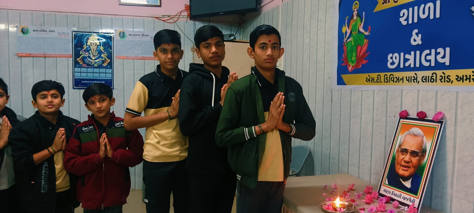 અમરેલી સ્થિત શ્રીજી વિદ્યાર્થી ભુવનમાં તારીખ ૨૫-૧૨-૨૦૨૫ ના રોજ ધોરણ ૫ થી ૧૨ ના વિદ્યાર્થીઓ અને સ્ટાફ દ્વારા ભારતના પૂર્વ વડાપ્રધાન અને ભારત રત્ન અટલ બિહારી બાજપાઈની જન્મ જયંતિની ઉજવણી કરવામાં આવી હતી. આ પ્રસંગે તેમના જીવનમાંથી પ્રેરણા લેવાનો અનુરોધ કરવામાં આવ્યો હતો અને તેમના ફોટાને પુષ્પાંજલિ અર્પણ કરવામાં આવી હતી. સંસ્થાની પરંપરા મુજબ મહાપુરુષોની જન્મ જયંતિ અને પુણ્યતિથિ નિમિત્તે તેમને પુષ્પો અર્પણ કરી તેમના જીવન-ઝરમરથી વિદ્યાર્થીઓને અવગત કરવામાં આવે છે. તે અંતર્ગત સંસ્થાના સંચાલક દિપકભાઈ વઘાસિયા દ્વારા પુષ્પ અર્પણ કરી દેશ માટે અટલજીના યોગદાનને યાદ કરવામાં આવ્યું હતું. સ્ટાફ દ્વારા અટલ બિહારી બાજપાઈના જીવન પ્રસંગો, તેમના કવિ હૃદય અને એક પ્રમાણિક રાજનીતિજ્ઞ તરીકેના તેમના ભવ્ય જીવન વિશે વિદ્યાર્થીઓને સમજ આપવામાં આવી હતી.