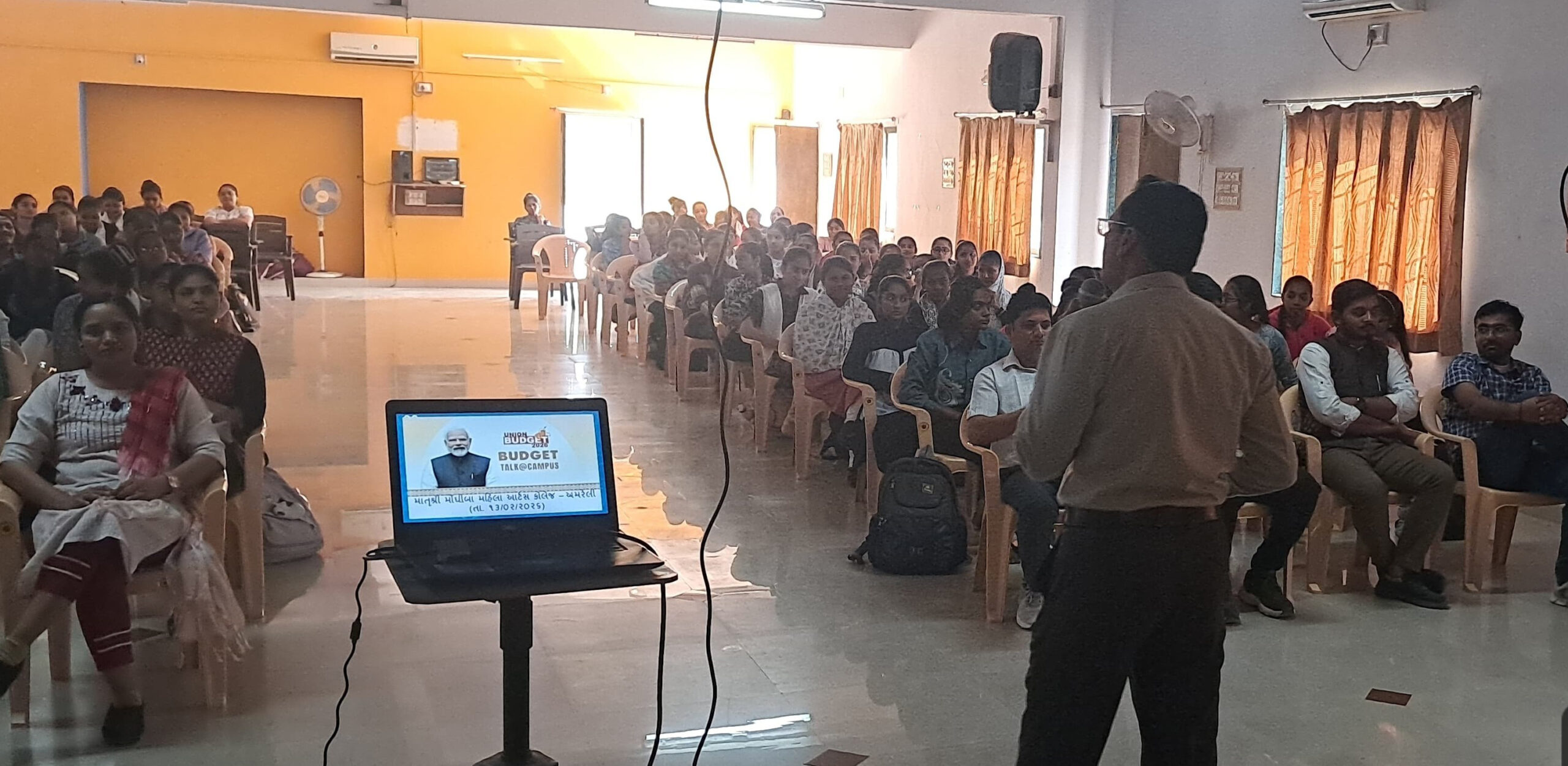 અમરેલી જિલ્લા વિદ્યાસભા સંચાલિત માતુશ્રી મોંઘીબા મહિલા આટ્ર્સ કાલેજમાં કેન્દ્રીય બજેટ-૨૦૨૬ અંતર્ગત ચર્ચા કરવાનો કાર્યક્રમ યોજાયો હતો. કાલેજના ઈન્ચાર્જ આચાર્ય ડો.જી.વી.વેલિયત દ્વારા મહેમાનોનું શાબ્દિક અને પુષ્યગુચ્છથી સ્વાગત કરવામાં આવ્યું હતું. ઈન્ચાર્જ આચાર્ય ડા.એ.જે.ચન્દ્રવાડિયા તથા સરકારના પ્રતિનિધિ તરીકે સામાજિક અગ્રણી કેતનભાઈ ધોળકિયા (નીલકંઠ જવેલર્સ) ઉપસ્થિત રહ્યા હતા. આ કાર્યક્રમમાં વક્તા તરીકે કે.કે.પારેખ કામર્સ કાલેજ-અમરેલીના અધ્યાપક ડા.એ.પી.ગોરવાડિયા ઉપસ્થિત રહ્યા હતા. તેમણે બજેટનો અર્થ, મહત્વ, તે કોના દ્વારા રજૂ કરવામાં આવતું હોય છે ? જેવા પ્રશ્નોની ચર્ચા કરીને નાણામંત્રી નિર્મલા સીતારમણે રજૂ કરેલ વર્ષ ૨૦૨૬ની બજેટની સરળ અને રસસભર ભાષામાં પી.પી.ટી. દ્વારા પ્રસ્તુતિ કરી હતી. સમગ્ર કાર્યક્રમનું સફળ અને સુચારુ સંચાલન ડા.એમ.જે. પટોળિયાએ કર્યું હતું અને આભારદર્શન ડા.વિલાસબેન સોરઠિયાએ કર્યું હતું.
