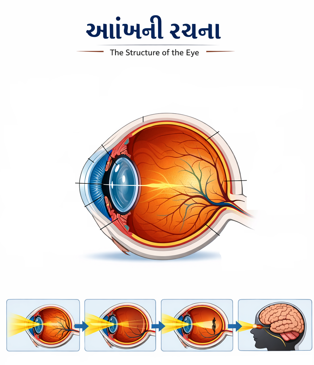 આંખ કેમેરાની જેમ કાર્ય કરે છે. બહારથી આવતો પ્રકાશ આંખના વિવિધ ભાગોમાંથી પસાર થઈ રેટિના સુધી પહોંચે છે અને પછી સંદેશ મગજ સુધી જાય છે.