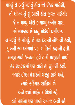 સત્ય એ છે કે ઈશ્વર આપણા મન માટે મજબુર નથી, અને આપણી ઇચ્છાનો ઓર્ડર લેવા બેઠેલા સેવક પણ નથી.આપણે એના દાસ છીએ અને એ તો ભક્તના મનનો મલિક છે અને આખા જગતનો મહાન શિલ્પકાર છે, જે ક્યારેક ઘા મારીને માણસને મૂર્તિ બનાવે છે. ઘણી વાર જે આપણે માંગીએ છીએ એ જ આપણું દુઃખ બની જાય છે અને જે આપણને ન મળે એ જ આપણું રક્ષણ બની જાય છે.જ્યારે આપણા રસ્તામાં રુકાવટ આવે,ત્યારે કદાચ ખાડો આગળ હશે ત્યારે દરવાજો બંધ થાય, ત્યારે કદાચ અંદર અંધકાર હશે.આપણી અરજી તાત્કાલિક સુખ માગે છે, ઈશ્વરની મરજી દીર્ઘકાલીન કલ્યાણ આપે છે.આપણી નજર આજ પર અટકે છે,ઈશ્વરની નજર આવતીકાલ પર હોય છે.