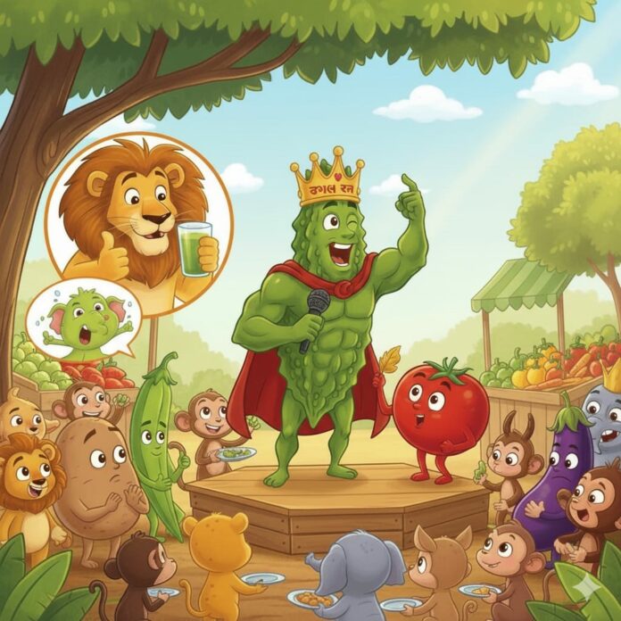એટલામાં સમાચાર આવ્યા કે જંગલના રાજા સિંહને પેટમાં બહુ દુઃખાવો ઉપડ્યો છે. સિંહ રાજાએ જાહેરાત કરી કે જે શાકભાજી એમનો દુઃખાવો મટાડશે, તેને ‘જંગલ રત્ન’નો ખિતાબ આપવામાં આવશે.