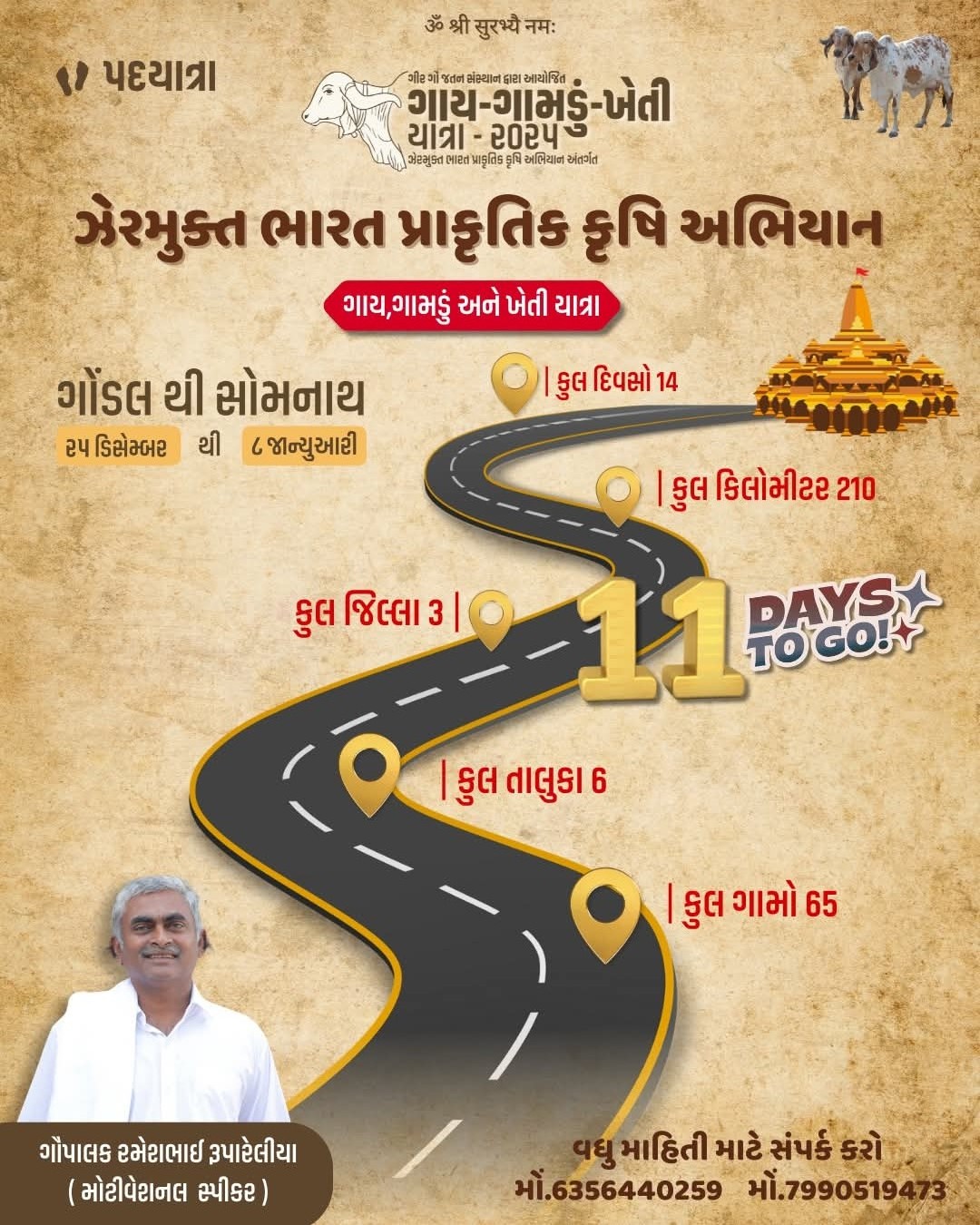 રમેશભાઈ રૂપારેલીયા ઝેરમુક્ત ભારત પ્રાકૃતિક અભિયાન ર૦રપ પદયાત્રા ગોંડલથી દેવાધિદેવ મહાદેવ સોમનાથ સુધી કરી રહ્યા છે. તા. રપ ડિસેમ્બરથી લઈને તા. ૮ જાન્યુઆરી સુધી ૧૧ દિવસ ચાલનારી આ પદયાત્રામાં ત્રણ જિલ્લાના ૬ તાલુકાના ૬પ ગામોમાં પસાર થશે. દરેક ગામડે ખેડૂત સાથે ઝેરમુક્ત ખેતી, ગાયનું મહત્વ અને ખેતી વિના ઉધ્ધાર નથી આ વાત ખેડૂતો, ખેતમજૂરો અને ગામડાઓમાં લોકો વચ્ચે કહેતા કહેતા યાત્રા આગળ વધશે.