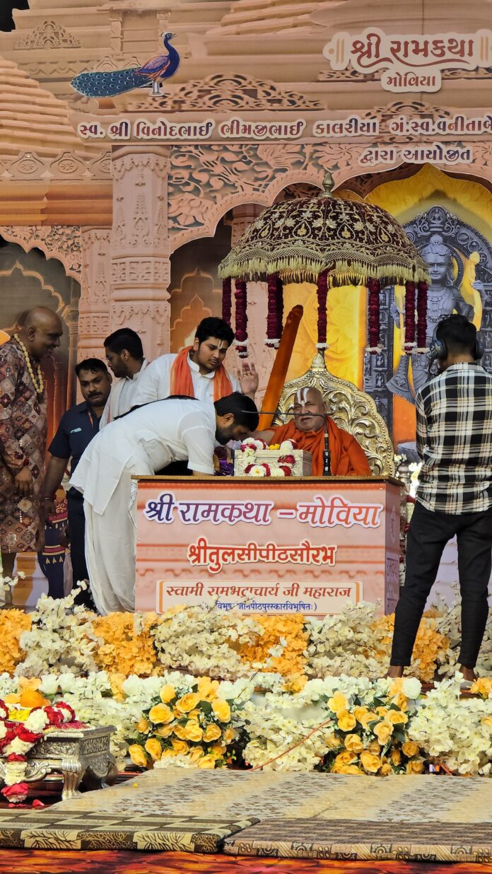 ગોંડલમાં પદ્મવિભૂષણ જગદગુરુ રામભદ્રાચાર્યજી મહારાજની રામકથાનું આયોજન કરવામાં આવ્યું છે. કથાના છઠ્ઠા દિવસના મુખ્ય મનોરથી મનીષભાઈ કાલરીયા અને તેમના પત્નીની લગ્નની ૩૧મી વર્ષગાંઠ નિમિત્તે જગદગુરુએ મંચ પરથી વિશેષ આશીર્વાદ પાઠવ્યા હતા. કથા શ્રવણ માટે આજે દિગ્ગજ નેતાઓ અને સામાજિક અગ્રણીઓ ઉમટી પડ્યા હતા. જીતુભાઈ વાઘાણી, રિવાબા જાડેજા, જીજ્ઞેશદાદા (રાધે રાધે) સહિતના હાજર રહ્યા હતા.
