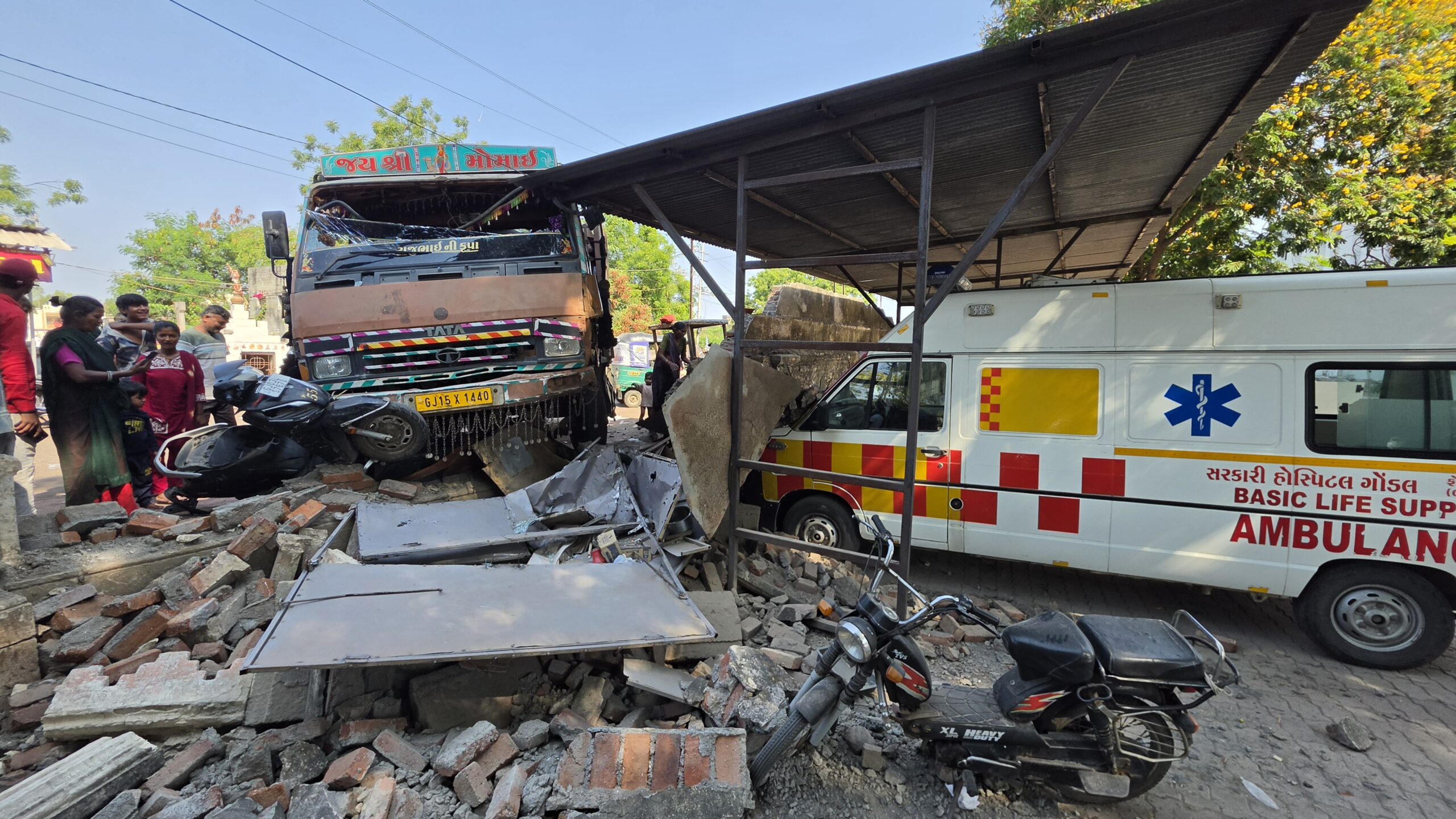 ગોંડલ સિવિલ હોસ્પિટલ પાસે આજે સવારે એક ચોંકાવનારી ઘટના બની હતી. હોસ્પિટલ બહાર ઉભેલા GJ-15-X-1440 નંબરના આઈસર ટ્રકમાં જ્યારે ભંગાર ભરાઈ રહ્યો હતો, ત્યારે એક નશામાં ધૂત અજાણ્યા શખ્સે અચાનક ટ્રક ચાલુ કરી ભગાવવાનો પ્રયાસ કર્યો હતો. સ્ટેરિંગ પરથી કાબૂ ગુમાવતા આઈસર હોસ્પિટલની દીવાલ તોડી અંદર ઘૂસી ગયું હતું. આ ભયાનક અકસ્માતમાં હોસ્પિટલની દીવાલ ધરાશાયી થઈ હતી અને પાર્ક કરેલી એમ્બ્યુલન્સ સહિત અનેક વાહનોનો કચ્ચરઘાણ નીકળી ગયો હતો. સદનસીબે, ગીચ વિસ્તાર હોવા છતાં કોઈ જાનહાનિ થઈ નથી. પોલીસે તાત્કાલિક સ્થળ પર પહોંચી નશાખોર શખ્સની ધરપકડ કરી કાયદેસરની કાર્યવાહી હાથ ધરી છે.