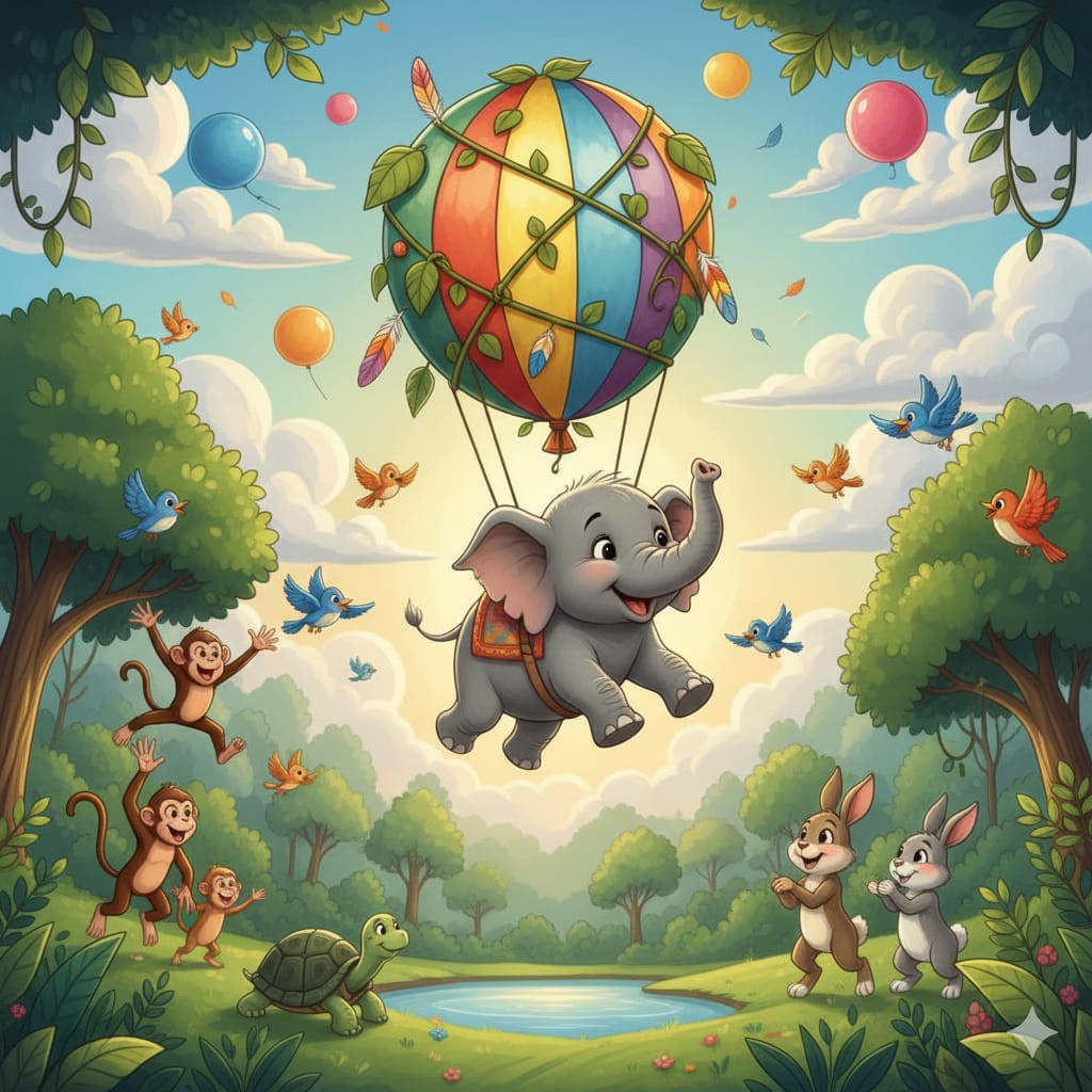 એક જંગલમાં ‘ચીકુ’ નામનો નાનો અને રમતિયાળ હાથી રહેતો હતો. ચીકુને આકાશમાં ઊડતાં પક્ષીઓ જોવાં બહુ ગમતાં. તે ઊંચે ઊડતાં પંખીઓને જોઈને વિચારતો, ‘વાહ! પક્ષીઓ તો કેવાં મજાથી ઊડે છે! મારે પણ એમની જેમ વાદળાં સુધી પહોંચવું છે; વાદળાંને અડવું છે.’