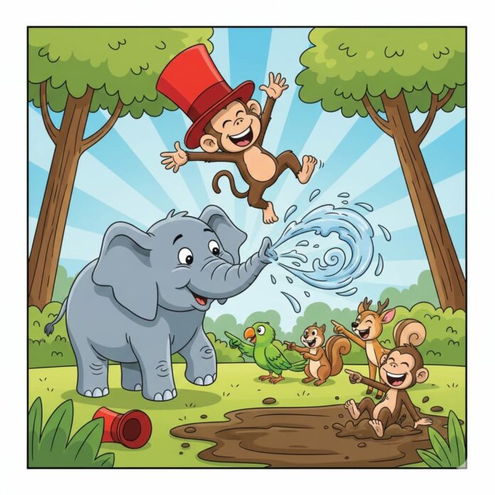 લાલુ તો ઠેકડો મારીને હાથીના કાન પર જઈને બેસી ગયો. હવે ભોલા હાથીના કાનમાં લાલુની પૂંછડી અડી એટલે હાથીભાઈને તો જોરદાર ગલીપચી થવા લાગી! હાથીભાઈએ તો પોતાની લાંબી સૂંઢ ઊંચી કરી અને આખું જંગલ ગજવી મૂકે તેવી મોટી છીંક ખાધી— ‘‘આચ્છુઉઉં…આચ્છુઉઉં!’’