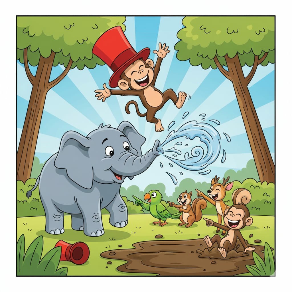 છીંક એટલી જોરદાર હતી કે લાલુ વાંદરો તો હવામાં ફુગ્ગાની જેમ ઊડ્યો! એ હવામાં ગોથાં ખાતો-ખાતો નીચે જઈને સીધો પાણી ભરેલા ખાબોચિયામાં ધબાક કરતો પડ્યો. ખાબોચિયાનું ગંદું પાણી ઊડ્યું અને લાલુ આખો ભીંજાઈ ગયો. ખાબોચિયામાં પડતાંની સાથે જ એની લાલ ટોપી ઊતરી ગઈ ને બાજુમાં પડી ગઈ.