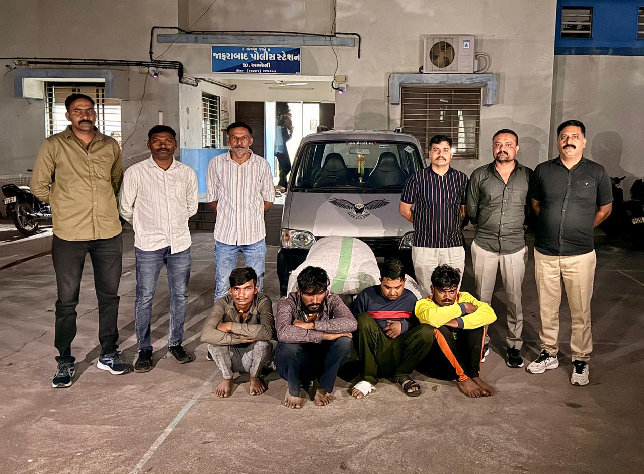 એલસીબી પીઆઈ વી.એમ. કોલાદરાની ટીમે ટેકનિકલ સોર્સના આધારે ચાર શંકાસ્પદ ઇસમોને ફોરવ્હીલ વાહનમાં મગફળી સાથે પકડી પાડ્યા હતા. સઘન પૂછપરછ દરમિયાન, આરોપીઓએ લોઠપુર ગામે મગફળીના પાકની ચોરી કર્યાની કબૂલાત કરી હતી. ઝડપાયેલા ચાર આરોપીઓમાં રાહુલભાઈ ઉર્ફે ગઢીયો પાંચાભાઈ વાઘેલા (ઉં.વ. ૨૫, રહે. બર્બટાણા, રાજુલા), મુનાભાઈ કનુભાઈ પરમાર (ઉં.વ. ૨૧, હાલ રહે. પોરબંદર, મૂળ રહે. લોઠપુર, જાફરાબાદ), સાગરભાઈ રામભાઈ પરમાર (રહે. લોઠપુર, જાફરાબાદ) અને ગોપાલભાઈ રામભાઈ પરમાર (ઉં.વ. ૨૦, રહે. લોઠપુર, જાફરાબાદ) નો સમાવેશ થાય છે. પોલીસે આરોપીઓ પાસેથી ૮ મણ મગફળી, જેની કિંમત રૂ.૮,૦૦૦/- છે, અને ચોરીમાં વપરાયેલ મારુતિ સુઝુકી કંપનીની ઇકો ફોરવ્હીલ જેની કિંમત રૂ.૩,૦૦,૦૦૦/- છે, તે મળી કુલ રૂ.૩,૦૮,૦૦૦/- નો મુદ્દામાલ જપ્ત કર્યો છે. આ ચોરી આશરે ૨૦ દિવસ પહેલા રાત્રિના એક વાગ્યાના અરસામાં લોઠપુર ગામે થઈ હતી. આરોપીઓ ઇકો ફોરવ્હીલ સાથે આવીને એક ઓરડીનું તાળું તોડી આશરે ૩૦ ગુણી મગફળીના પાકની ચોરી કરીને ફરાર થઈ ગયા હતા. આ અંગે જાફરાબાદ પોલીસ સ્ટેશનમાં અગાઉ ફરિયાદ નોંધાઈ હતી.