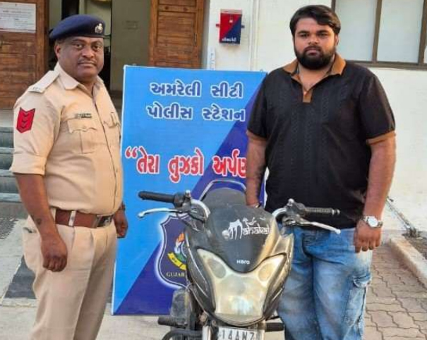“તેરા તુજકો અર્પણ” કાર્યક્રમ અંતર્ગત નાગરિકોની ગુમ થયેલ મિલકત સત્વરે શોધી મૂળ માલિકને પરત કરવા અન્વયે અમરેલી સિટી પોલીસે મોટા બસ સ્ટેન્ડ પાસેથી ગુમ થયેલ રૂ. ૭૦,૦૦૦ની હીરો પેશન પ્રો શોધી અરજદાર દીપભાઈ દવેને પરત સોંપ્યુ હતું. બનાવની વિગત મુજબ, અમરેલીના અરજદાર દીપભાઈ હરેશભાઈ દવે ગત તા. ૦૭/૦૨/૨૦૨૬ના રોજ અમરેલી મોટા બસ સ્ટેન્ડ પાસે આવેલ એઈમ્સ હોસ્પિટલ ખાતે ગયા હતા, ત્યારે તેમણે પાર્ક કરેલ પોતાનું હીરો પેશન પ્રો મોટરસાયકલ ગુમ થયું હતું. આ અંગે અમરેલી સિટી પોલીસ સ્ટેશનમાં અરજી કરવામાં આવી હતી.