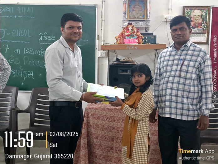 અમેરિકન ઇન્ડિયા ફાઉન્ડેશન (AIF) દ્વારા દિપશાળા પ્રોજેક્ટ અંતર્ગત દામનગર પ્રાથમિક કન્યાશાળા ખાતે તા.૨/૮/૨૦૨૫ ના રોજ ધોરણ-૭ની વિદ્યાર્થિનીઓ માટે ટેબ્લેટ વિતરણ કાર્યક્રમ યોજાયો હતો. અમેરિકા સ્થિત દાતા ભરતભાઈ દેસાઈ કે જેઓ અમરેલી જિલ્લાના વતની છે તેમના દ્વારા આ પ્રોજેક્ટનું મોનીટરીંગ થઇ રહ્યું છે. ટેબ્લેટ વિતરણના આ કાર્યક્રમમાં સી.આર.સી. દિલીપભાઈ પરમાર, શાળાના આચાર્ય મહેન્દ્રભાઈ ઓઝા, કો-ઓર્ડીનેટર અમિતભાઈ પરમાર, એસ.એમ.સી. અધ્યક્ષ ઉષાબેન સોલંકી, સભ્યો કનુભાઈ પરમાર, રજનીભાઈ ગોહિલ અને ધોરણ-૭ માં અભ્યાસ કરતી વિદ્યાર્થિનીઓ સાથે તેમના વાલીઓ ઉપસ્થિત રહ્યા હતા.