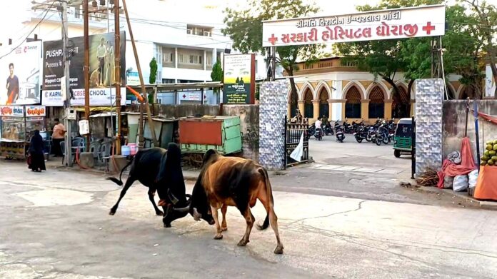 ધોરાજી શહેરમાં રખડતા આખલાઓ, પશુઓ અને કૂતરાઓના વધતા ત્રાસથી નગરજનો ત્રાહિમામ પોકારી ઉઠ્યા છે. ગતરોજ શહેરના મુખ્ય ગણાતા ગેલેક્સી ચોક, ત્રણ દરવાજા, ગાંધી ચોક અને જેતપુર રોડ જેવા ભરચક વિસ્તારોમાં આખલાઓ વચ્ચે ભીષણ યુદ્ધ સર્જાયું હતું. આ આખલા યુદ્ધને કારણે રસ્તા પર પસાર થતા લોકોમાં ભારે ભયનો માહોલ ફેલાયો હતો અને નાસભાગ મચી ગઈ હતી. આ અફરાતફરી દરમિયાન આખલાઓએ એક સાયકલ ચાલક અને બાઈક સવારને હડફેટે લેતા તેમને સામાન્ય ઈજાઓ પહોંચી હતી. રખડતા પશુઓ અને શ્વાનોને નાથવામાં ધોરાજી નગરપાલિકા તંત્ર સંપૂર્ણપણે નિષ્ફળ રહ્યું હોવાનું સામે આવ્યું છે. પાલિકા પાસે આવા પશુઓને પૂરવા માટે જરૂરી માળખાગત સુવિધાઓનો અભાવ હોવાથી લોકો લાચારી અનુભવી રહ્યા છે. તંત્રની આ ઘોર બેદરકારી અને યોગ્ય આયોજનના અભાવે અવારનવાર સર્જાતી આવી દુર્ઘટનાઓને પગલે સ્થાનિક રહીશોમાં પાલિકા શાસકો સામે ઉગ્ર રોષ જોવા મળી રહ્યો છે. બીજી તરફ, નગરપાલિકા દ્વારા હાલ ઉપલેટા રોડ પર નવા પશુવાડાનું નિર્માણ કરવામાં આવી રહ્યું હોવાની જાણકારી મળી છે. સ્થાનિકો આશા સેવી રહ્યા છે કે આ પશુવાડો તૈયાર થયા બાદ શહેરને રખડતા ઢોરની વર્ષો જૂની અને ગંભીર સમસ્યામાંથી કાયમી છુટકારો મળશે.
