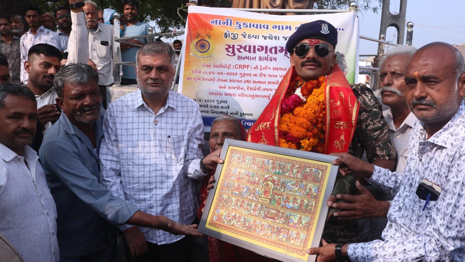 અમરેલી જિલ્લાના નાની કુંકાવાવ ગામના પનોતા પુત્ર અને ભારતીય સેનાના જવાન જયેશ જયસુખભાઈ જેઠવા તાલીમ પૂર્ણ કરી પ્રથમ વખત વતન પધારતા સમગ્ર ગામ હિલોળે ચડ્યું હતું. સતત આઠ પ્રયત્નો બાદ સેનામાં પસંદગી પામેલા જયેશભાઈએ મહારાષ્ટ્રના લાતુરમાં કઠોર તાલીમ સફળતાપૂર્વક પૂર્ણ કરી છે. હાલ મણિપુરમાં ફરજ બજાવતા આ જવાનનું ગ્રામજનો દ્વારા ડીજે અને દેશભક્તિના ગીતો સાથે ભવ્ય સામૈયું કરવામાં આવ્યું હતું. પટેલ વાડી ખાતે યોજાયેલા સન્માન સમારોહમાં ગામનું ગૌરવ અને પૂર્વ લાયન્સ ડિસ્ટ્રીકટ ગવર્નર વસંતભાઈ મોવલીયા, વર્ષીલભાઈ મોવલીયા તથા જિલ્લા પંચાયત પૂર્વ પ્રમુખના પ્રતિનિધિ જલ્પેશભાઈ મોવલીયા, સરપંચ જયસુખભાઈ, પૂર્વ સરપંચ બાવચંદભાઈ, મનસુખભાઇ, સન્માન સમિતિ બેચરભાઈ વેકારીયા, શાંતિભાઈ ઢોલરીયા, જગદીશ કડેવાળ, જીતુભાઇ ઢોલરીયા, આચાર્ય શ્રીપાલભાઈ, પ્રા. શાળા પરિવાર, પૂર્વ આચાર્ય જયદીપભાઈ પટેલ વતી પ્રવીણભાઈ રાણપરિયા, ગુરુ શીલાબેન વતી ઉદયભાઈ દેસાઈ તથા રમેશભાઈ, વિગેરે પ્રતિનિધિઓ અને સમગ્ર જેઠવા પરિવાર અને સગા સ્નેહીઓ અને પિતા જયસુખભાઈ તથા મોટાભાઈ હસમુખભાઈ વિગેરેએ પણ અભિવાદન કર્યું હતું. ભાવુક ક્ષણોમાં ફૌજીએ પોતાના પિતા અને મોટાભાઈને સેલ્યુટ કરી કેપ પહેરાવી સન્માન કર્યું હતું, તેમજ સ્વર્ગસ્થ માતાની તસ્વીરને વંદન કર્યા હતા. શાળા પરિવાર અને સન્માન સમિતિ દ્વારા આયોજિત આ કાર્યક્રમનું સંચાલન ઉદયભાઈ દેસાઈએ કર્યું હતું. આ પ્રસંગે સમગ્ર જેઠવા પરિવાર અને ગ્રામજનોમાં અનેરો ઉત્સાહ જોવા મળ્યો હતો.