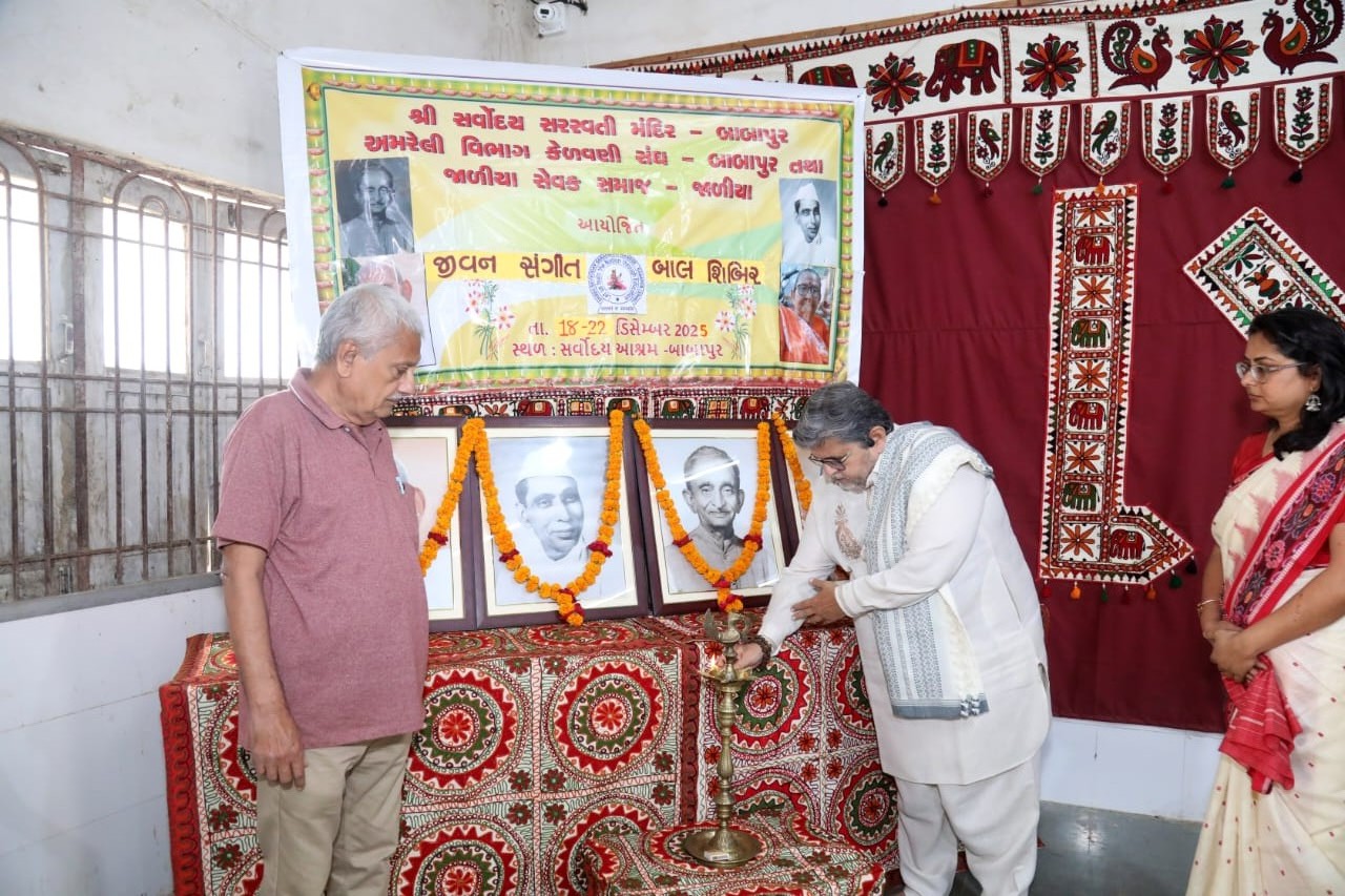 બાબાપુરમાં સર્વોદય સરસ્વતી મંદિરમાં શ્રદ્ધેય પૂ.લાલજી ગુરુજી તથા સ્વ. પૂ. બાલુકાકા તેમજ પૂ. દાદા (ગુણવંતરાય પુરોહિત) અને પૂ. મોટાબા (હસુમતીબેન પુરોહિત)ની સ્મૃતિમાં જીવન સંગીત શિબિરનું ઉદ્ઘાટન આજે થયું હતું. આ શિબિરની શરૂઆત સરગમ ગ્રુપ દ્વારા ગીત રજૂ કરી, મુખ્ય મહેમાન શિક્ષણવિદ ડો. ભદ્રાયુભાઈ વચ્છરાજાનીના હસ્તે દીપ પ્રાગટ્યથી થઇ હતી. આ શિબિરમાં સંસ્થાના નિયામક મંદાકિનીબેન જી. પુરોહિત હાજર રહ્યા હતા. શિબિર ૬ દિવસની હોવાથી જુદા જુદા જૂથમાં કાર્ય કરવામાં આવશે, સંગીતના સાત સૂર આધારિત જીવન શિબિર, જીવન નિર્માણ, ચારિત્ર નિર્માણ કરવા માટે વિદ્યાર્થીઓમાં ચારિત્ર નિર્માણની ભાવના જાગે, રાષ્ટ્ર નિર્માણની ભાવના જાગે તેવા હેતુથી શિબિરનું આયોજન કરવામાં આવ્યું હતું. આભાર વિધિ જયંતીભાઈ જોશી દ્વારા તથા પરિચય પ્રવીણભાઈ પંડ્યા દ્વારા આપવામાં આવ્યો હતો. આજથી ધોરણ ૧૧ ના વિદ્યાર્થીઓની આ શિબિરમાં જુદી જુદી શાળાના ધોરણ-૧૧ના ૨૫૦ જેટલા વિદ્યાર્થીઓ ઉપસ્થિત રહ્યા હતા.