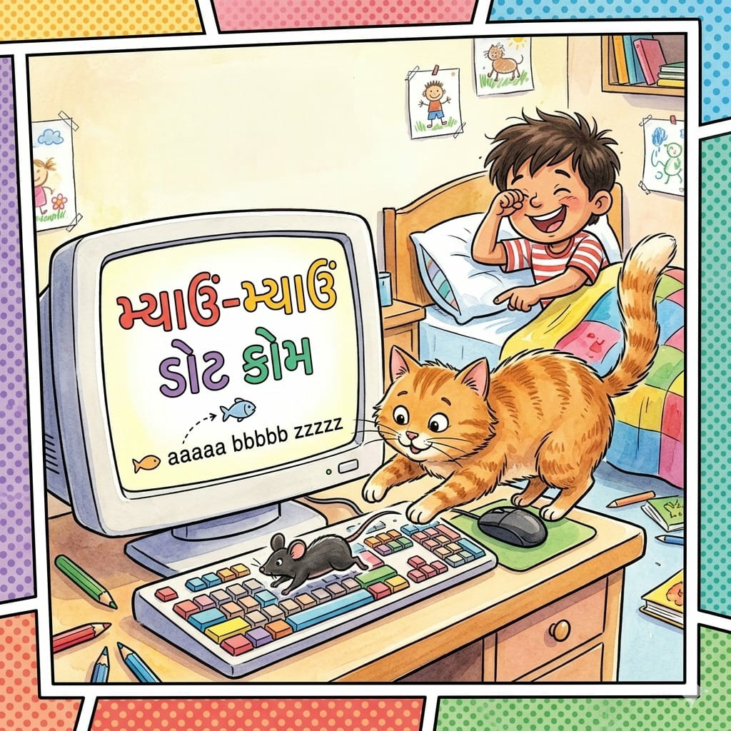 બિલાડી તો રાજી થઈ ગઈ! એને લાગ્યું કે એણે કોઈ નવી ભાષા શોધી કાઢી છે. એ તો કીબોર્ડ પર નાચવા લાગી. ક્યારેક ‘એન્ટર’ દબાય તો ક્યારેક ‘સ્પેસ બાર’. કમ્પ્યૂટરમાંથી અચાનક અવાજ આવ્યો— “બ્રીપ… બ્રીપ…!” બિલાડીને લાગ્યું કે કમ્પ્યૂટર એની સાથે વાતો કરી રહ્યું છે. એણે પણ સામે જવાબ આપ્યો, “મ્યાઉં… મ્યાઉં…!”