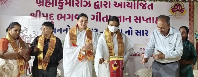 અમરેલીમાં જેસીંગપરા ખાતે બ્રહ્માકુમારીઝ દ્વારા ‘‘શ્રીમદ ભગવત ગીતા જ્ઞાન સપ્તાહ -જીવનનો આધાર ગીતાનો સાર” પાંચ દિવસીય ગીતા જ્ઞાન અમૃતપાન રાજયોગીની બ.કુ. કિંજલદીદી કરાવી રહ્યા છે. જેસીંગપરામાં નીલકંઠ ચોક ખાતે તા.૨૭ માર્ચ થી ૩૧ માર્ચ સુધી દરરોજ રાત્રીના ૮.૩૦ થી ૧૦.૩૦ વાગ્યા સુધી આ આયોજન કરવામાં આવ્યું છે. આ ગીતા જ્ઞાન સપ્તાહનો પ્રારંભ બ્રહ્માકુમારીના મુખ્ય સંચાલિકા ગીતાદીદી સાનિધ્યમાં, જિલ્લા વિકાસ અધિકારી તથા જેસીંગપરાના અગ્રગણ્ય નાગરિકોની બહોળી હાજરીમાં દિપ પ્રજવલન ધ્વારા કરવામાં આવેલ. પ્રથમ દિવસેજ ૫૦૦ થી વધારે ભાઈ બહેનોએ ઉપસ્થિત રહી ગીતા જ્ઞાનનું અમૃતપાન કર્યું હતું.