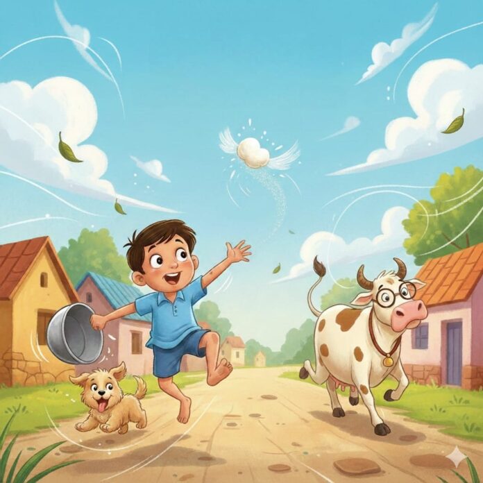 ગાયમાતાએ ચશ્મા ચઢાવીને જોયું, તો સાચે જ સફેદ-સફેદ કંઈક ઊડતું હતું. ગાય પણ જોડાઈ – ‘અંમ્બા… અંમ્બા…’ કરતી!