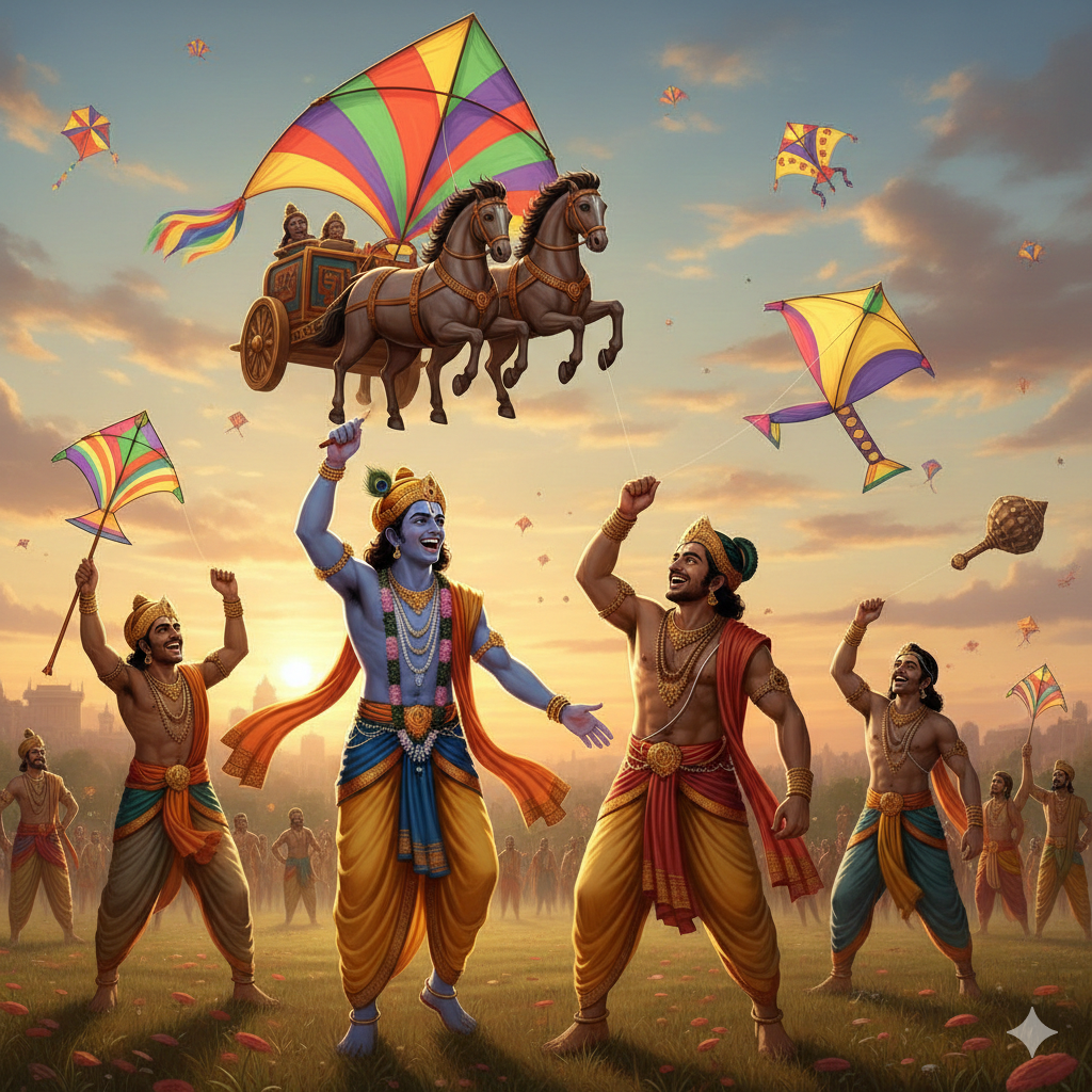 પણ ગાંધીજી સાથે મારા મતભેદો છે. હકીકતમાં મહાભારતનું યુદ્ધ એ કોઈ રૂપક નથી પરંતુ એક ‘પતંગ યુદ્ધ’ છે. પાંડવો અને કૌરવો એકબીજા સામે હાથાપાઈ કરીને લડ્યા જ નથી. બાણ, તલવાર, ભાથા, ભાલા, તીર; આ બધા પતંગોનાં નામ છે. બી.આર. ચોપરાએ આકાશમાં ટકરાતાં શાસ્ત્રો બતાવ્યા છે તે હકીકતમાં શસ્ત્રો નથી પણ એક પ્રકારના પતંગો છે. યુદ્ધભૂમિ પરના આકાશમાં શસ્ત્રો ધીમે-ધીમે નજીક આવે, ટકરાય, તૂટી પડે… આ બધું શું ? હકીકતમાં તો એ પતંગોના પેચ લડાવતા હોય તેનું વર્ણન છે. ‘કાપો… કાપો…”ના નારા એ પેચ લડાવવા માટે એકબીજાને પાનો ચડાવવા માટેના નારા છે. ખુદ કૃષ્ણએ આ પતંગ પોતે ઉડાવ્યો હતો એવું વર્ણન છે. તેના બનેવી અર્જૂનની ફિરકી પકડવાનું સ્વીકાર્યું હતું. પતંગયુદ્ધ પહેલા એવી જાહેરાત કરી હતી કે હું પતંગ ઉડાવીશ નહી, માત્ર ફીરકી જ પકડીશ. પણ વચ્ચે અર્જુનનો પતંગ કપાઈ જાય એવી પરિસ્થિતિ ઉભી થતા કૃષ્ણએ ફીરકીનું એક બાજુનું ચકરડું કાઢીને તેનો લંગર બનાવી સામાવાળાના પતંગને લપેટાવવાની કોશિશ કરી હતી.