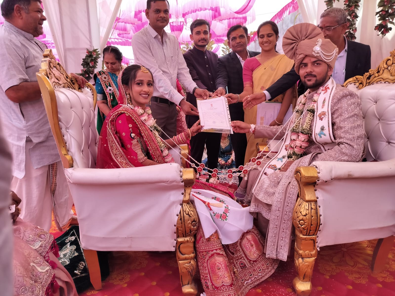 રાજસ્થળી ગ્રામ પંચાયત દ્વારા એક નવી અને પ્રેરણાદાયક પહેલ હાથ ધરવામાં આવી છે, જેના અંતર્ગત રાજસ્થળી ગામે લગ્નના દિવસે જ લગ્ન નોંધણી પૂર્ણ કરી મંડપમાં જ નવદંપતીને મેરેજ સર્ટિફિકેટ (લગ્ન નોંધણી પ્રમાણપત્ર) આપવામાં આવ્યું હતું. ગ્રામ પંચાયતના સભ્ય કૈલાસબેન ગુણવંતભાઈ સાવલિયાની દીકરી ચિ. શર્મિલાબેનના લગ્ન પ્રસંગે આ પ્રક્રિયા હાથ ધરવામાં આવી હતી. લગ્નના દિવસે જ સાક્ષીઓ, ગોર મહારાજ, નવદંપતી તેમજ તેમના માતા-પિતાની સહી અને જરૂરી દસ્તાવેજો મેળવી ચકાસણી (વેરિફિકેશન) કરવામાં આવી હતી. તમામ ધાર્મિક તથા વહીવટી પ્રક્રિયા પૂર્ણ કર્યા બાદ સરપંચ ગણપતભાઈ સેંજલિયા અને તલાટી-કમ-મંત્રી દેવયાનીબેન પરમાર દ્વારા મંડપમાં જ મેરેજ સર્ટિફિકેટ અર્પણ કરવામાં આવ્યું હતું. આ પ્રસંગે ખોડલધામ પરિવાર, અમરેલી દ્વારા નવદંપતીને શ્રી યંત્ર અર્પણ કરી ખેસ પહેરાવી શુભકામનાઓ પાઠવવામાં આવી હતી.