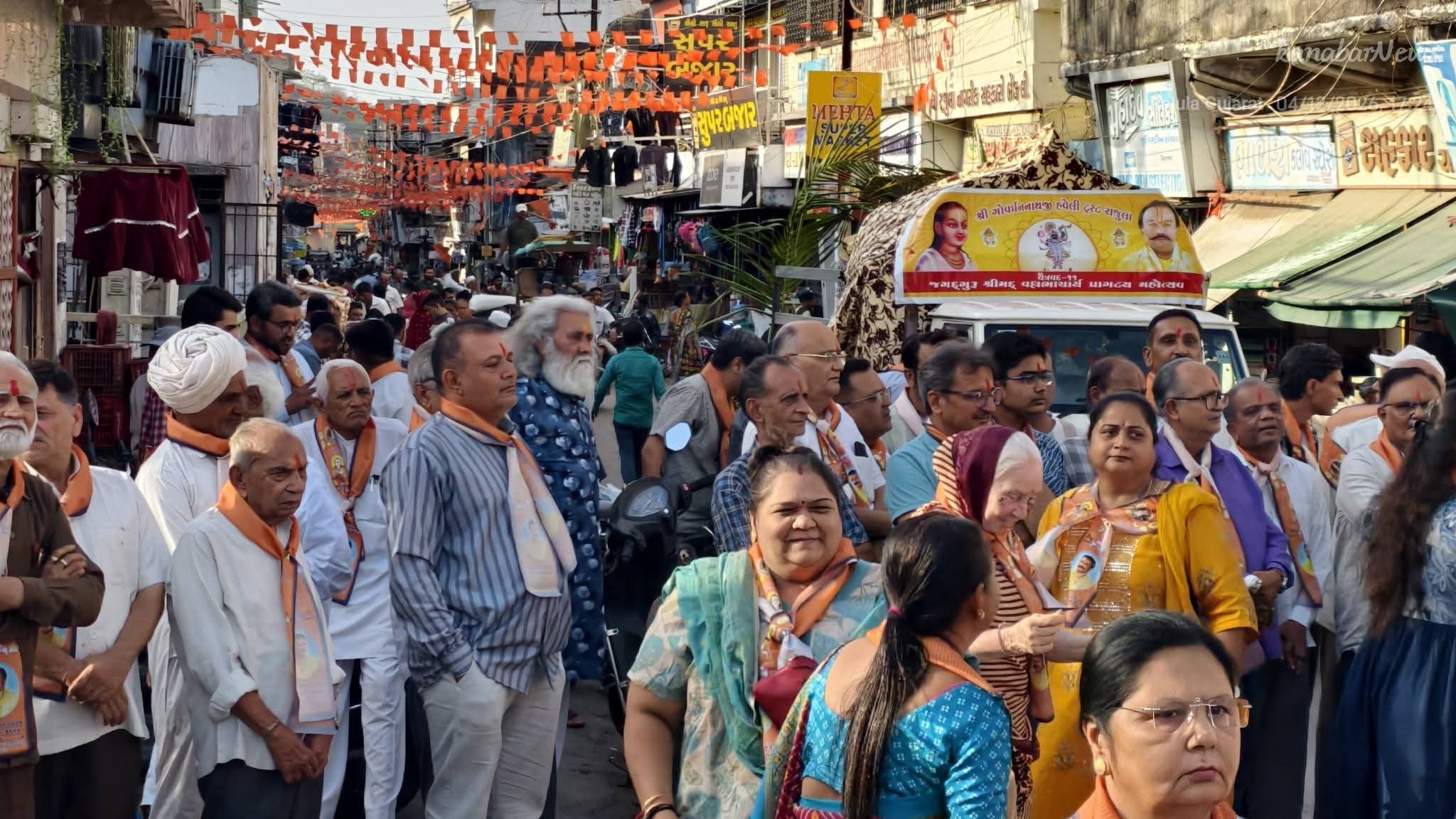 રાજુલા શહેરમાં ચૈત્ર વદ અગિયારસના પવિત્ર દિવસે જગતગુરૂ શ્રીમદ વલ્લભાચાર્ય મહાપ્રભુજીના ૫૪૯મા પ્રાગટ્ય દિવસ નિમિત્તે ભવ્ય શોભાયાત્રાનું આયોજન કરવામાં આવ્યું હતું. ગોવર્ધનનાથજી હવેલી ટ્રસ્ટ દ્વારા આયોજિત આ યાત્રા હવેલીથી પ્રારંભ થઈ શહેરના મુખ્ય માર્ગો, ટાવર ચોક અને એસટી બસ સ્ટેન્ડ સહિતના વિસ્તારોમાં ફરી હતી.સમગ્ર શહેરમાં ભક્તિમય માહોલ સર્જાયો હતો અને વૈષ્ણવજનો દ્વારા વિવિધ સ્થળોએ ઠંડુ પાણી, શરબત તેમજ આઈસ્ક્રીમનું વિતરણ કરવામાં આવ્યું હતું. આ ધાર્મિક સ્થાનિક વેપારીઓએ મોટી સંખ્યામાં ઉપસ્થિત રહી દર્શનનો લાભ લીધો હતો.