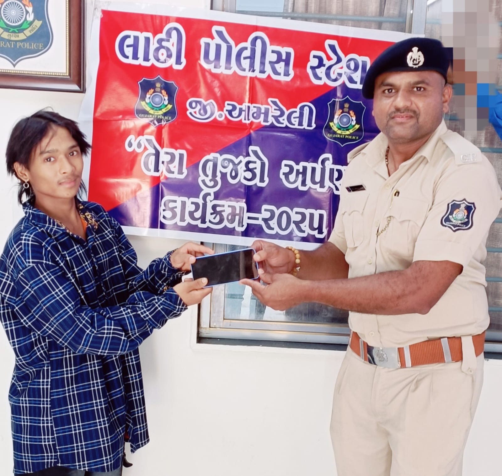 જીલ્લાઓમાં મિલ્કત ગુમના બનાવોમા સત્વરે મિલકત શોધી મુળ માલીકને પરત કરવા તથા તેરા તુજકો અર્પણ” કાર્યક્રમ સાર્થક કરવા સુચના આપેલ આપી છે. જે અનુસંધાને લાઠી પોલીસ સ્ટેશનના પોલીસ ઇન્સ્પેક્ટર એસ.એમ.સોનીની જરૂરી સુચના અને માર્ગદર્શન હેઠળ અરજદાર વિનયભાઇ બુધ્ધરામભાઈ ચૌધરી રહે. માલવીયા પીપરીયા વાળાઓનો મોબાઈલ ગુમ થયેલ હોય અને મોબાઈલ ચાલુ હાલતમાં હોવાની ફરિયાદ નોંધાઈ હતી. જેને મોબાઈલના નંબર આધારે ટેકનીકલ સોર્સથી લાઠી પોલીસ સ્ટેશન વિસ્તારમાંથી ગુમ થયેલ મિલકત શોધી મુળ માલીકને પરત કરી ‘તેરા તુજકો અર્પણ કાર્યક્રમ સાર્થક કર્યો હતો.