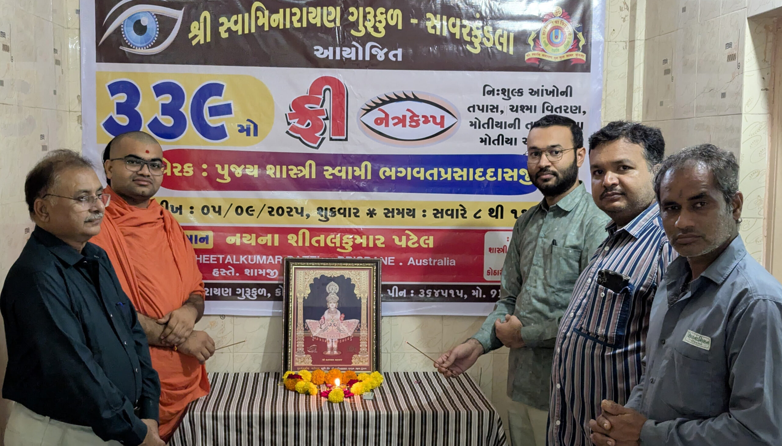 સ્મૃતિમાં ૩૩૯મા નેત્ર કેમ્પનું આયોજન કરવામાં આવ્યું હતું. જેમાં વીરનગર હોસ્પિટલના સુપર સ્પેશ્યાલીસ્ટ ડોકટરો દ્વારા ૭૦ જેટલા મોતિયાના દર્દીઓની તપાસ કરી કુલ ૧૫ જેટલા દર્દીઓને મોતિયાના ઓપરેશનની જરૂર હોય તેમને વિનામૂલ્યે ઓપરેશન માટે વીરનગરની આંખની હોસ્પિટલમાં મોકલવામાં આવેલ. ચશ્મા અને દવાઓની જરૂરિયાતવાળા દર્દીઓને વિનામૂલ્યે ચશ્મા તેમજ દવાઓ પૂરી પાડવામાં આવી હતી. નેત્રયજ્ઞનું દીપ પ્રાગટ્ય સંસ્થાના વડા પરમ પૂજ્ય શાસ્ત્રી ભગવતપ્રસાદદાસજી સ્વામી, સંસ્થાનાં પ્રમુખ શાસ્ત્રી હરિપ્રસાદ દાસજી સ્વામીના સાનિધ્યમાં ગુરુકુળના સંત શુકદેવજી સ્વામી તથા વીરનગર હોસ્પિટલના ડોક્ટર સાથે કરવામાં આવેલ.
