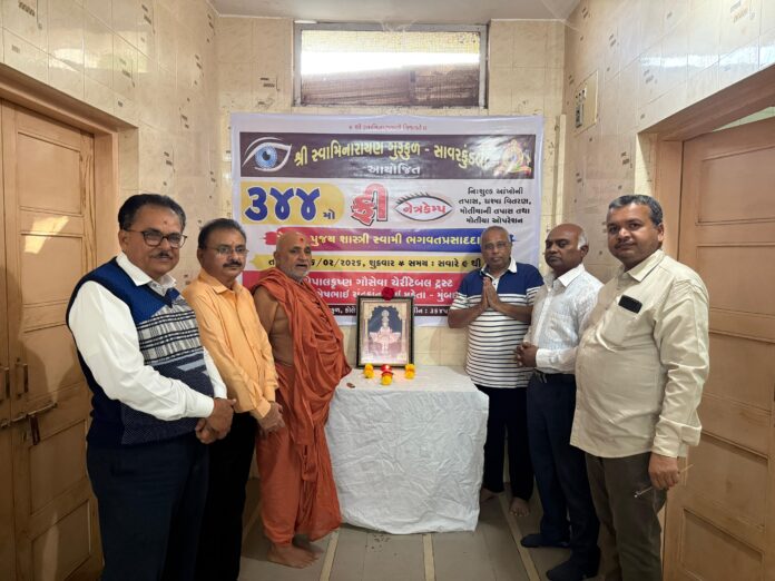 સાવરકુંડલામાં શ્રી સ્વામિનારાયણ ગુરુકુળ દ્વારા દર માસના પ્રથમ શુક્રવારે યોજાતા પરંપરાગત નેત્ર કેમ્પની શૃંખલામાં ૦૬-૦૨-૨૦૨૬ના રોજ ૩૪૪મો વિનામૂલ્યે નેત્ર નિદાન કેમ્પ યોજાયો હતો. શાસ્ત્રી સ્વામી જ્ઞાનપ્રસાદદાસજીની સ્મૃતિમાં આયોજિત આ કેમ્પમાં અનેક દર્દીઓએ લાભ લીધો હતો. આ કેમ્પનો પ્રારંભ સંસ્થાના વડા પરમ પૂજ્ય શાસ્ત્રી ભગવતપ્રસાદદાસજી સ્વામી તથા મુખ્ય દાતા ગોપાલ કૃષ્ણ ગૌસેવા ચેરિટેબલ ટ્રસ્ટ (મુંબઈ)ના નિમેષભાઈ ચંદ્રકાંતભાઈ મહેતા દ્વારા કરવામાં આવ્યું હતું. આ પ્રસંગે વીરનગરના નિષ્ણાત તબીબો અને ગુરુકુળ હોસ્પિટલના ડો. નિલેશભાઈ ત્રિવેદી વિશેષ ઉપસ્થિત રહ્યા હતા.