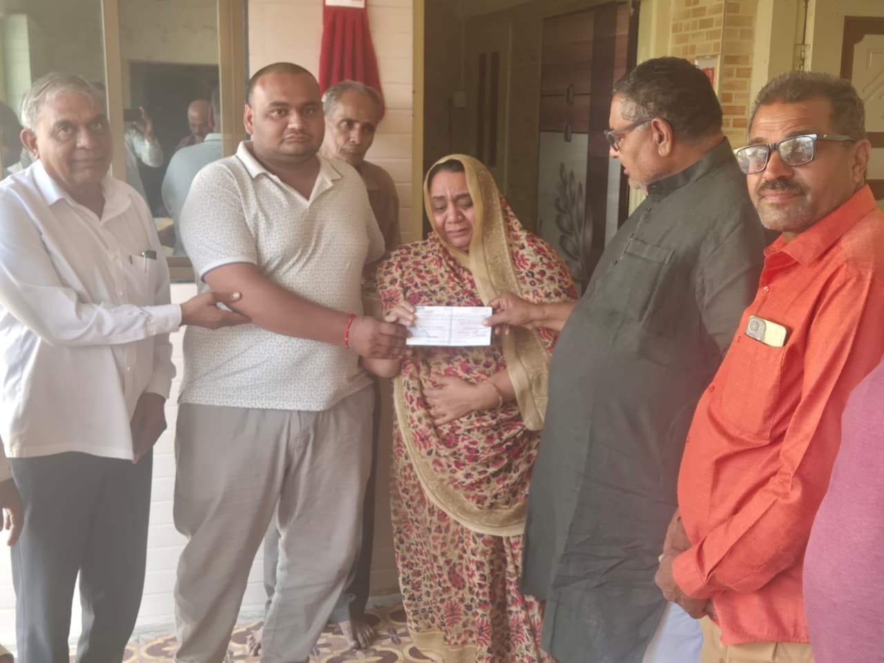 ગુજરાત મંડપ હાયરર્સ ઇલેક્ટ્રિકલ એસોસિએશન દ્વારા સંચાલિત પરિવાર સુરક્ષા કવચ યોજનાના ભાગરૂપે ભોજલરામ મંડપ સર્વિસ, સાવરકુંડલાના સ્વ. અનિલભાઈ જયાણીના પરિવારને દિવંગત રાશિ રૂપે કુલ રૂ. ૭ લાખનો ચેક અર્પણ કરવામાં આવ્યો હતો. આ દિવંગત રાશિ સહાય સ્વ. અનિલભાઈ જયાણીના ધર્મપત્ની ગં. સ્વ. વર્ષાબેન જયાણીને રવિવારના રોજ ગુજરાત મંડપ હાયરર્સ ઇલેક્ટ્રિકલ એસોસિએશનના ટ્રસ્ટી તથા પટેલ મંડપ સર્વિસના માલિક વજુભાઈ ગોલ તથા અમરેલી જિલ્લા મંડપ કોન્ટ્રાક્ટર એસોસિએશનના પદાધિકારીઓના હસ્તે અર્પણ કરવામાં આવેલ હતી. આ અવસરે વજુભાઈ ગોલે માહિતી આપતાં જણાવ્યું હતું કે એસોસિએશન દ્વારા શરૂ કરાયેલ પરિવાર સુરક્ષા કવચ યોજના સભ્યોના કુદરતી કે આકસ્મિક અવસાનના સંજોગોમાં પરિવારમાં આર્થિક ભાર હળવો થાય તે માટે રચવામાં આવી છે. સભ્ય હયાત ન હોય ત્યારે તેમના પરિવારને આર્થિક મદદરૂપ થવાનો આ નમ્ર તથા કલ્યાણકારી પ્રયાસ એસોસિએશન દ્વારા સતત કરવામાં આવી રહ્યો છે. આ પ્રસંગે અમરેલી જિલ્લા મંડપ કોન્ટ્રાક્ટર એસોસિએશનના પ્રમુખ ગોરધનભાઈ માદલીયા, ઉપપ્રમુખ બાલુભાઈ માતરીયા, મંત્રી સંજયભાઈ પોકળ, સહમંત્રી જયેશભાઈ સતાણી, સાવરકુંડલા મંડપ એસોસિએશનના પ્રમુખ કૌશિકભાઈ માધવાણી, ચેતનભાઇ જોષી, રાજુભાઈ લાડવા, બકુલભાઈ જયાણી, સફીભાઈ સરવૈયા વગેરેએ ઉપસ્થિત રહી પરિવારને સાંત્વના આપી ભવિષ્યમાં જરૂર પડે ત્યારે મદદરૂપ થવા ખાતરી આપેલ હતી.