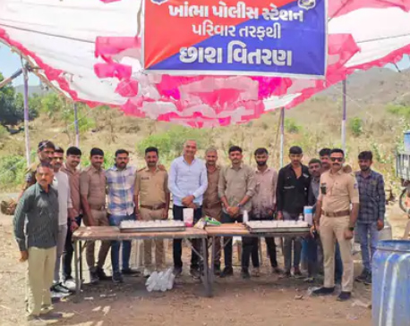 ખાંભા પોલીસે હનુમાન જયંતિના પવિત્ર અવસરે હનુમાન ગાળા ખાતે દર્શનાર્થીઓ માટે છાશ વિતરણ કેન્દ્ર શરૂ કર્યું હતું. આકરા ઉનાળાના ગરમીના માહોલ વચ્ચે મોટી સંખ્યામાં ઉમટી પડેલા ભક્તો અને રાહદારીઓને રાહત આપવાના ઉમદા હેતુથી આ સુંદર વ્યવસ્થા ગોઠવવામાં આવી હતી. પોલીસ કર્મચારીઓએ પોતે જ હાજર રહીને સૌને ઠંડી છાશનું વિતરણ કર્યું હતું અને આ સેવાનો અસંખ્ય ભક્તોએ ઉત્સાહભેર લાભ લીધો હતો. સ્થાનિક લોકો તેમજ આગેવાનો દ્વારા પોલીસના આ સંવેદનશીલ પ્રયાસને ખૂબ બિરદાવવામાં આવ્યો હતો.