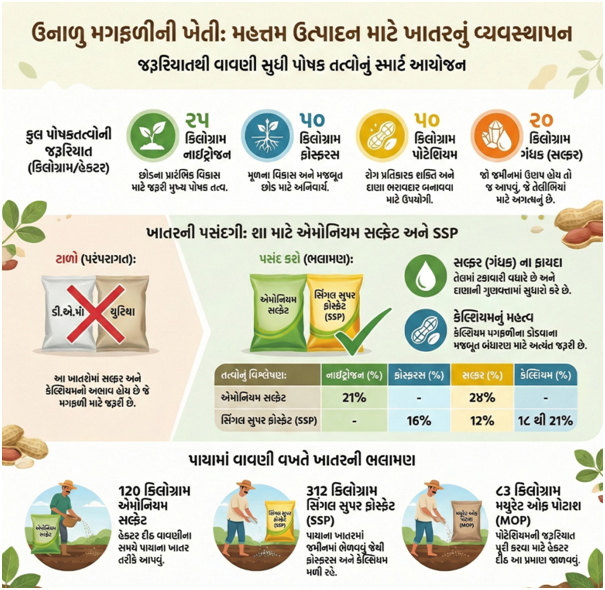 • નિંદામણ:પ્રિ-ઈમરજન્સ તરીકે મગફળીનું વાવેતર કર્યા બાદ ઉગતા પહેલા જરૂર જણાય તો જ નિંદામણ નાશક દવા સ્ટોમ્પનો છંટકાવ કરવો. • બીજને પટટ્: બીજને થાયરમનો પટ આપવો ત્યારબાદ રાઈઝોબીયમ અને ફોસ્ફેટ કલ્ચરનો પણ પટ આપીને વાવેતર કરવું. • ઉનાળુ વાવેતર માટે ભરોસાપાત્ર એગ્રો પાસેથી સમયસર બિયારણ મેળવી લેવું. • જૂનાગઢ