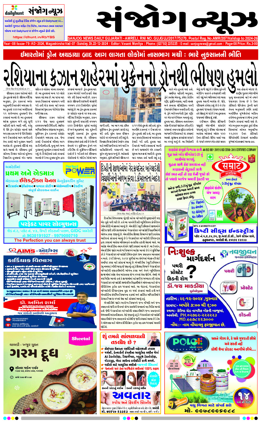 Home ઇપેપેર E- NEWS PAPER 22/12/2024 ઇપેપેર E- NEWS PAPER 22/12/2024 By Sanjog News - 22/12/2024 RELATED ARTICLESMORE FROM AUTHOR E-paper 28-02-2026 E- PAPER 27-02-2026 E-paper 26-02-2026 E- PAPER 25-02-2026 E -PAPER 24-02-2026 E-paper 22-02-2026 E- PAPER 21-02-2026 E – PAPER 20-02-2026 E- PAPER 19-02-2026 E-PAPER 18-02-2026 E-paper 17-02-2026 E- PAPER 16-02-2026 વિરાટ કોહલીનો રેકોર્ડ જાખમમાં, પાકિસ્તાની ખેલાડી પાસે મોટી તક છે 26/02/2026 આ મારી છેલ્લી ચૂંટણી, હવે કોઈ ચૂંટણી નહીં લડું, દિનુમામાનો હુંકાર,... 25/02/2026 મહાકાલેશ્વર મંદિરમાં સાંજ અને શયન આરતી માટે પ્રતિ વ્યકિત ૨૫૦ રૂપિયા... 23/02/2026 વડોદરાના તરસાલીમાં ડમ્પરની બેફામ ઝડપે લીધો એકટીવા સવાર યુવકનો જીવ 22/02/2026 પાંચ રાજ્યો માટે ચૂંટણીનું બ્યુગલ વાગી ગયું છે! ચૂંટણી પંચના અધિકારીઓ... 21/02/2026 કોડીનાર ડેપોના એસટી કંડક્ટરની પ્રમાણિકતા, મુસાફરનો બસમાં ભૂલાયેલો મોબાઈલ પરત આપ્યો 23/02/2026 વંડા ગામે ઇન્સ્ટાગ્રામ પર સસ્તો સામાન વેચવાની લાલચ આપી વેપારી સાથે... 27/02/2026 ટીમ ઇન્ડિયાએ ઓસ્ટ્રેલિયાના ગૌરવને તોડી નાખ્યું, સતત ૧૦ ઘરઆંગણે શ્રેણી જીતનો... 22/02/2026 સભાસદના વારસદારને રૂ.૧ લાખનો ચેક અર્પણ કરવામાં આવ્યો 27/02/2026 રાજકોટ મનમંદિર એપાર્ટમેન્ટમાં લાગી આગ, માતા પુત્રનું નીપજ્યું મોત 26/02/2026