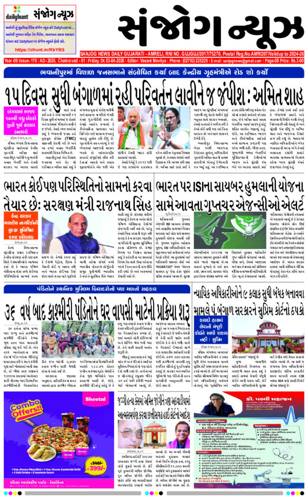 Home ઇપેપેર E- PAPER 03-04-2026 ઇપેપેર E- PAPER 03-04-2026 By Sanjog News - 03/04/2026 RELATED ARTICLESMORE FROM AUTHOR E- PAPER 04-04-2026 E-paper 01-04-2026 E-paper 31-03-2026 PDF 30-03-2026 E-paper 29-03-2026 E- PAPER 28-03-2026 E Paper 26.03.2026 E- PAPER 26-03-2026 E-paper 25-03-2026 E-paper 24-03-2026 E- PAPER 23-03-2026 E-paper 22-03-2026 પ્રેમની ઓછપમાં દોષ દેખાયા કરશે ને ભરપૂર પ્રેમમાં અવગુણ દૂર દૂર... 29/03/2026 જાફરાબાદના લુણસાપુર પે-સેન્ટર શાળા ખાતે વાર્ષિકોત્સવનું આયોજન 29/03/2026 02/04/2026 આરસીબીએ ૨૦૦+ રનના લક્ષ્યનો પીછો કરીને એક નવો રેકોર્ડ બનાવ્યો, આરઆરનો... 29/03/2026 અમરેલીના સેવાભાવી યુવાન ભાવેશ કાબરીયાના દુઃખદ અવસાનથી ઘેરા શોકની લાગણી 30/03/2026 સુદાનમાં અજાણ્યા બંદૂકધારીઓએ આતંક મચાવ્યો, ૭૦ થી વધુ લોકોની ક્રૂરતાથી હત્યા... 31/03/2026 જૂનાગઢમાં નરસિંહ મહેતાની પ્રતિમા ખંડિત કરવામાં આવતા શહેરમાં રોષનો માહોલ 01/04/2026 બાબરા શહેર ખાતે કોંગ્રેસનો જનસંવાદ કાર્યક્રમ યોજાયો 31/03/2026 અમરેલીના સોનારિયા ગામેથી ૫ લીટર દેશી દારૂ પકડાયો 31/03/2026 મોનાલિસા પહેલા રુદ્રાક્ષના માળા વેચતી હતી અને હવે તે કલમાનો પાઠ... 31/03/2026