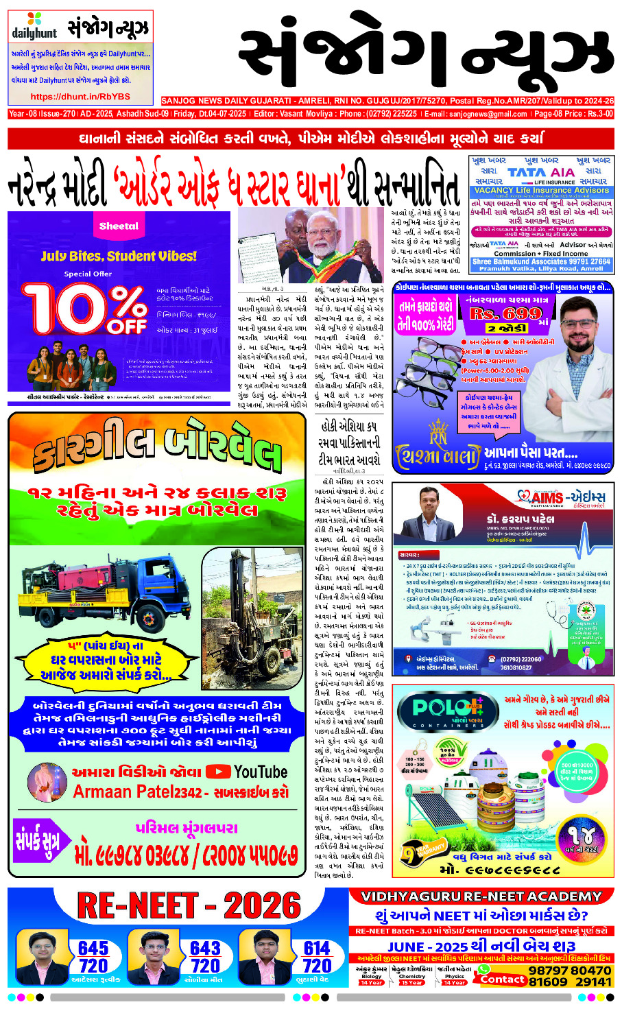 Home ઇપેપેર E-paper 04-07-2025 ઇપેપેર E-paper 04-07-2025 By Sanjog News - 04/07/2025 RELATED ARTICLESMORE FROM AUTHOR E-paper 17-02-2026 E- PAPER 16-02-2026 E-paper 15-02-2026 E- PAPER 14-02-2026 E- PAPER 13-02-2026 E-paper 12-02-2026 E- PAPER 11-02-2026 E – PAPER 10-02-2026 E-paper 09-02-2026 E-paper 08-02-2026 E-paper 06-02-2026 E – PAPER 05-02-2026 અજિત પવારે મંત્રાલય તરફથી મહત્વપૂર્ણ ફાઇલની રાહ જાતા ખાનગી વિમાનમાં મુસાફરી... 13/02/2026 અજય દેવગણની ફિલ્મ શતક આપણને આરએસએસના ૧૦૦ વર્ષના ઇતિહાસ અને બલિદાનની... 14/02/2026 બ્રિટનમાં પુરુષો અને સ્ત્રીઓ વચ્ચે પગાર તફાવત છે, ૩૦ વર્ષમાં આ... 16/02/2026 સુરતમાં ‘વિચારોનું વાવેતર’ કાર્યક્રમ ઊંઘતા લોકોને જગાડવાનું કાર્ય કરે છેઃ શૈલેશભાઈ... 15/02/2026 અમરેલી કૃષિ વિજ્ઞાન કેન્દ્ર ખાતે પાંચ દિવસીય તાલીમ સંપન્ન 17/02/2026 સૂર્યાએ જારદાર થપ્પડ મારી’, હારથી ગુસ્સે થયેલા ભૂતપૂર્વ ક્રિકેટરે પાકિસ્તાની ટીમ... 17/02/2026 થરામાં સોની વેપારીની કારમાંથી ૧૦ કિલો ચાંદીની ચોરી, પોલીસની કામગીરી સામે... 13/02/2026 ડાકોર ખાતે ફાગણી પૂનમે બપોરે બે વાગ્યાથી મંદિરના દ્વાર બંધ રહેશે,... 11/02/2026 સાવરકુંડલા તાલુકાના ખેડૂતોની ટેકાના ભાવથી સવા પાંચ લાખ ગુણી મગફળીની ખરીદી 13/02/2026 અમરેલીમાં જિલ્લા ભાજપ કાર્યાલયે પં. દીનદયાળ ઉપાધ્યાયના નિર્વાણ દિને પુષ્પાંજલિ અર્પણ... 12/02/2026