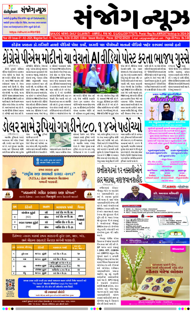 Home ઇપેપેર E- PAPER 04-12-2025 ઇપેપેર E- PAPER 04-12-2025 By Sanjog News - 04/12/2025 RELATED ARTICLESMORE FROM AUTHOR E- PAPER 16-01-2026 E- PAPER 14-01-2026 E-paper 13-01-2026 E- PAPER 12-01-2026 E-paper 11-01-2026 E-paper 10-01-2026 E -PAPER 09-01-2026 E- PAPER 08-01-2026 E-paper 07-01-2026 E-paper 06-01-2026 E-paper 05-01-2026 E-PAPER 04-01-2026 અમરેલીના લીલીયામાં ભાજપ સદસ્ય વાલજીભાઈની પુત્રવધૂ દયાબેન ન્યાય માટે ઘર બહાર... 09/01/2026 ઉત્તર ભારતમાં પહેલા ક્યારેય ન હોય તેવી ઠંડી ; દિલ્હીએ તેની... 11/01/2026 અમે એવું વર્તન કરી રહ્યા છીએ કે જાણે બધું બરાબર છે,”... 11/01/2026 ગુજરાતમાં ઉત્તરાયણે ઈમરજન્સી કોલ સતત રણક્યાં, સાંજના ૬ વાગ્યા સુધીના આંકડા... 15/01/2026 વૈભવ સૂર્યવંશી પછી, વધુ ત્રણ ખેલાડીઓએ અડધી સદી ફટકારી, વર્લ્ડ કપ... 11/01/2026 પ્રભાસની ‘ધ રાજાસાબ’ ફિલ્મે બીજા દિવસે બોક્સ ઓફિસ પર ૧૦૦ કરોડનો... 11/01/2026 રાજુલા શહેરમાં એક દિવસીય રાષ્ટ્રીય પરિસંવાદનું આયોજન કરાયું 13/01/2026 “હું તને પ્રેમ કરું છું,” છૂટાછેડા પછી માહી વિજ ફરી પ્રેમમાં... 11/01/2026 ધોરાજીમાં સૈયદ મુસ્તુફા બાવા શિરાજીના ઉર્સ નિમિત્તે મેડિકલ કેમ્પ યોજાયો 13/01/2026 ઈરાન પર હુમલો કરવાની અમેરિકાની ધમકીથી રશિયા ગુસ્સે છે, તેણે કડક... 15/01/2026