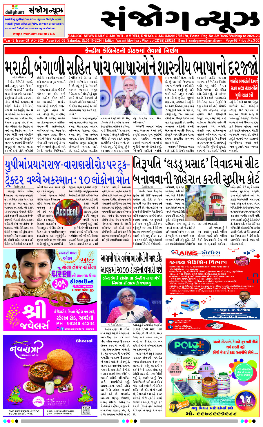 Home ઇપેપેર E-paper 05/10/2024 ઇપેપેર E-paper 05/10/2024 By Sanjog News - 05/10/2024 RELATED ARTICLESMORE FROM AUTHOR E- PAPER 27-02-2026 E-paper 26-02-2026 E- PAPER 25-02-2026 E -PAPER 24-02-2026 E-paper 22-02-2026 E- PAPER 21-02-2026 E – PAPER 20-02-2026 E- PAPER 19-02-2026 E-PAPER 18-02-2026 E-paper 17-02-2026 E- PAPER 16-02-2026 E-paper 15-02-2026 યોગી આદિત્યનાથની સિંગાપોર મુલાકાતના પહેલા દિવસે, યુનિવર્સલ સક્સેસ ગ્રુપ સાથે ૬,૬૫૦... 23/02/2026 ડાકોરમાં ફાગણી પૂનમની પદયાત્રામાં ડીજે તેમજ લાઉડ સ્પીકર નહીં વગાડવા નિર્ણય 23/02/2026 જૂનાગઢ ભારતી આશ્રમ ખાતે જાફરાબાદના નિધિબેન ઠાકર ‘શ્રેષ્ઠ શિક્ષક’ એવોર્ડથી સન્માનિત 21/02/2026 મિશેલ માર્શે તોફાની ઇનિંગ્સ રમી, રોહિત અને ઇશાનને પાછળ છોડીને, નેધરલેન્ડના... 21/02/2026 કાગધામ મજાદર ખાતે મોરારીબાપુની હાજરીમાં ‘કાગ એવોર્ડ’ અર્પણ સમારોહ યોજાયો 23/02/2026 ક્રાંકચ ગામે ટ્રેક્ટરની ટ્રોલીમાંથી પટકાયેલી બાળકી પર વ્હીલ ફરી વળતા મોત 21/02/2026 સહારા ઈન્ડિયા ની નાણાં પરત કરવાની પ્રક્રિયા ઝડપી,૧૦ લાખ સુધીની થાપણો... 26/02/2026 જીરા ગામે ‘‘બેટી બચાઓ બેટી પઢાઓ’’ યોજના અંતર્ગત મહિલા જાગૃતિ અને... 26/02/2026 ખેડાઃ સત્તાના મોહમાં ભાજપમાં ગયેલા ભારતસિંહ પરમાર ફરી કોંગ્રેસના શરણે! 24/02/2026 રાજુલામાં સાડી લેવા ગયેલી યુવતી લાપતા બની 25/02/2026