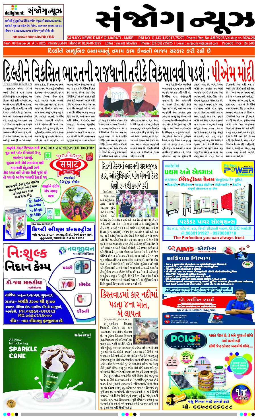 Home ઇપેપેર E-paper 06-01-2025 ઇપેપેર E-paper 06-01-2025 By Sanjog News - 06/01/2025 RELATED ARTICLESMORE FROM AUTHOR E-paper 27-11-2025 E- PAPER 26-11-2025 E- PAPER 25-11-2025 E-paper 24-11-2025 E-paper 21-11-2025 E-paper 20-11-2025 E-paper 19-11-2025 E-paper 18-11-2025 E-paper 17-11-2025 E – PAPER 16-11-2025 E-PAPER 15-11-2025 E- PAPER 14-11-2025 વડોદરાની સોસાયટીમાં પોલીસના દરોડા,રૂ.૧.૫ કરોડની ચલણી નોટો અને ૩ કિલો સોનાના... 25/11/2025 મિસ મેક્સીકોને મિસ યુનિવર્સના ખિતાબથી નવાજવામાં આવી છે,ફર્સ્ટ રનર અપ થાઈલેન્ડ 21/11/2025 વડોદરામાં ડિજિટલ અરેસ્ટનો પહેલો ભોગઃ ૬૫ વર્ષીય અતુલભાઈએ ગુમાવ્યો જીવ 21/11/2025 બિહાર અને બંગાળમાં ભૂકંપઃ કિશનગંજમાં લોકો ઘર છોડીને ભાગી ગયા, રિક્ટર... 21/11/2025 દિલ્હી-એનસીઆરમાં શ્વાસ લેવામાં તકલીફ પડી,૫૦ ટકા કર્મચારીઓને ઘરેથી કામ કરવાનો આદેશ 25/11/2025 રવિન્દ્ર જાડેજાએ ૬ વિકેટ લઈને એક મોટી સિદ્ધિ હાંસલ કરી, જે... 26/11/2025 અમદાવાદ-બાવળા હાઇ-વે મોતની ચિંચિયારીઓથી ગૂંજ્યો,૪ લોકોના મોત 27/11/2025 ભાજપમાં સાઈડલાઈન થયેલા જવાહર ચાવડા ફરી એકટીવ થયા, પોતાની જ સરકાર... 25/11/2025 જાફરાબાદના લાઈટહાઉસ રોડ પાસે સ્મશાનગૃહ રોડનું ખાતમુહૂર્ત કરાયું 24/11/2025 વરાછા-સરથાણા બ્રિજ નીચે દારૂ-ડ્રગ્સ-જુગારનું અડ્ડો બન્યું, ધારાસભ્ય કુમાર કાનાણી 27/11/2025