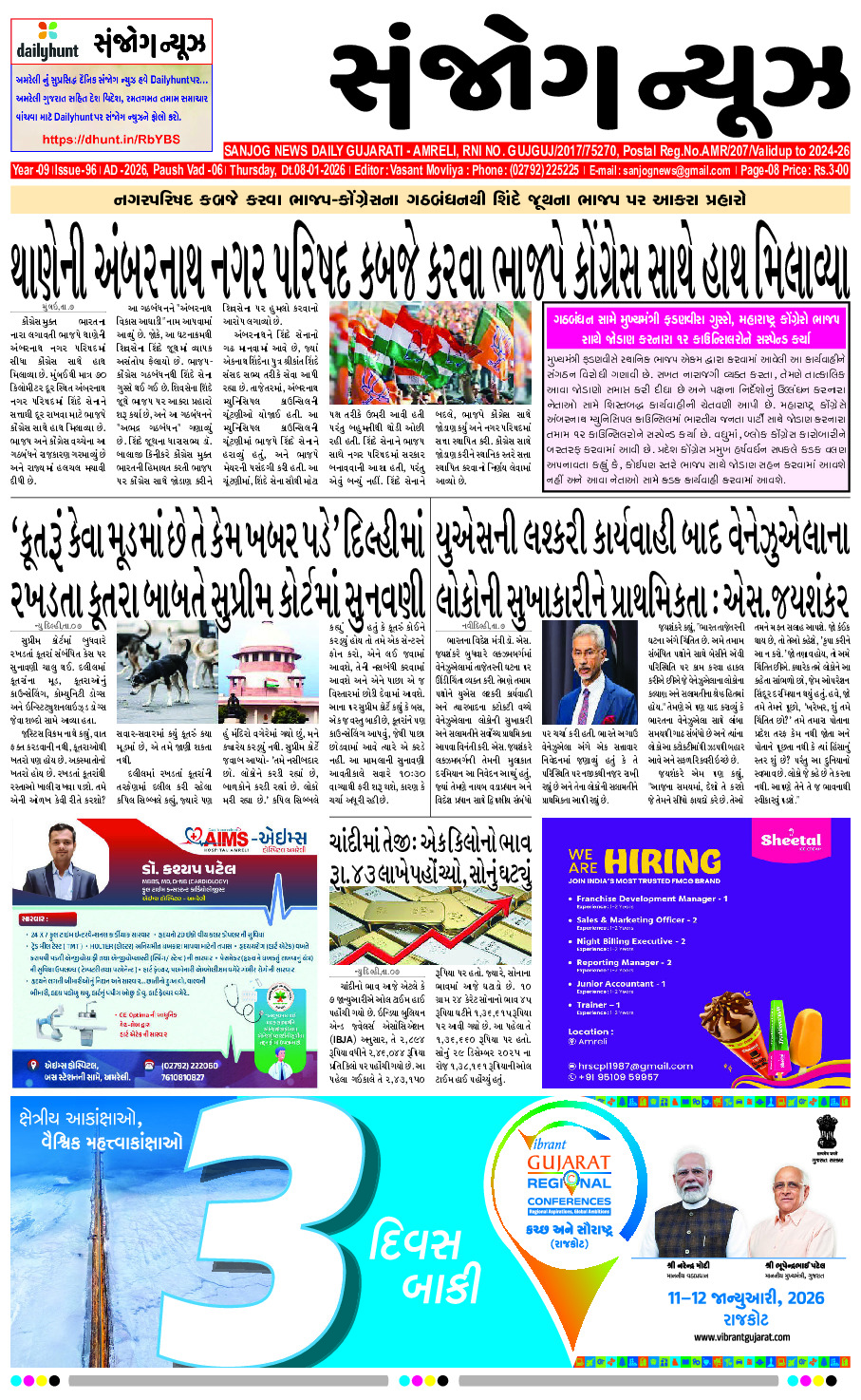 Home ઇપેપેર E- PAPER 08-01-2026 ઇપેપેર E- PAPER 08-01-2026 By Sanjog News - 08/01/2026 RELATED ARTICLESMORE FROM AUTHOR E-paper 10-01-2026 E -PAPER 09-01-2026 E-paper 07-01-2026 E-paper 06-01-2026 E-paper 05-01-2026 E-PAPER 04-01-2026 E-paper 03-01-2026 E- PAPER 02-01-2026 E- PAPER 01-01-2026 E-paper 31-12-2025 E – PAPER 30-12-2025 E – PAPER 29-12-2025 સીએમ ભજનલાલ શર્મા દ્વારા ઈ-ઝીરો એફઆઈઆરનું ઔપચારિક લોચિંગ 08/01/2026 ઉનાના ચીખલીમાં રાષ્ટ્રીય પક્ષી મોરના શિકારના અવશેષો મળ્યા 05/01/2026 ઐતિહાસિક બદલાવની ઉલટી ગણતરી શરૂ, ઈનકમ ટેક્સના ઈતિહાસમાં થશે ૭૫ વર્ષનો... 05/01/2026 દામનગરમાં વારંવાર થતા આખલાયુધ્ધથી લોકોમાં ભય 09/01/2026 લોકસભા અધ્યક્ષની તપાસ સમિતિ કાયદા વિરુદ્ધ’; સુપ્રીમ કોર્ટમાં ન્યાયાધીશ યશવંત વર્માનો... 07/01/2026 પીએમ નરેન્દ્ર મોદીએ આઇસીજીએસ સમુદ્ર પ્રતાપની પ્રશંસા કરી 07/01/2026 શું નાણામંત્રી સીતારમણ બજેટમાં ચોખાના નિકાસકારોને રાહત આપશે,બજેટમાં અનેક રાહત પગલાંની... 06/01/2026 જનતાને રોગચાળા વચ્ચે મૂકીને ગાંધીનગરના અધિકારી- પદાધિકારીઓ ક્રિકેટ રમવા ઉપડી ગયા 06/01/2026 સાવરકુંડલાના ઘાંડલાથી ચીખલી રોડ વચ્ચેનું ફાટક બંધ રહેતા લોકો પરેશાન 08/01/2026 કરુર ભાગદોડ કેસમાં થલાપતિ વિજયને નોટિસ ફટકારી, સીબીઆઈએ તેમને ૧૨ જાન્યુઆરીએ... 06/01/2026