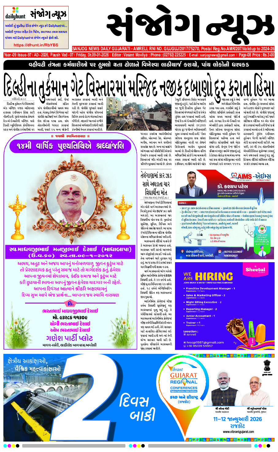Home ઇપેપેર E -PAPER 09-01-2026 ઇપેપેર E -PAPER 09-01-2026 By Sanjog News - 09/01/2026 RELATED ARTICLESMORE FROM AUTHOR E-paper 10-01-2026 E- PAPER 08-01-2026 E-paper 07-01-2026 E-paper 06-01-2026 E-paper 05-01-2026 E-PAPER 04-01-2026 E-paper 03-01-2026 E- PAPER 02-01-2026 E- PAPER 01-01-2026 E-paper 31-12-2025 E – PAPER 30-12-2025 E – PAPER 29-12-2025 સા.કુંડલાની વી.ડી. ઘેલાણી કોલેજ ખાતે ત્રિવિધ કાર્યક્રમ યોજાયો 06/01/2026 બગસરામાં ટેકાના ભાવે મગફળી ખરીદીમાં કરોડોના ભ્રષ્ટાચારનો કોંગ્રેસનો આક્ષેપ 05/01/2026 અમરેલી જિલ્લામાં આજથી કરૂણા અભિયાન, અબોલ પક્ષીઓનું રક્ષણ કરવા અનુરોધ 10/01/2026 દક્ષિણ સુંદરી સુસ્મિતા સેનના માર્ગ પર ચાલે છે, ૨૪ વર્ષની ઉંમરે... 08/01/2026 શિવસેનાને રોકવા માટે ભાજપ અને કોંગ્રેસ હાથ મિલાવ્યા, મહારાષ્ટ્રની નગર પરિષદમાં... 07/01/2026 ન્યૂઝીલેન્ડ સામેની વનડે શ્રેણી ૧૧ જાન્યુઆરીથી શરૂ થશે,રોહિત શર્મા અને શુભમન... 09/01/2026 ધારીમાં દામાણી પરિવાર દ્વારા પ્લોટ પ્રાથમિક શાળાના નવનિર્માણ માટે ભૂમિપૂજન 07/01/2026 “તેરા તુજકો અર્પણ”, અમરેલી સીટી પોલીસે રવિવારી બજારમાંથી ગુમ થયેલો મોબાઈલ... 05/01/2026 દાહોદના ગરબાડામાં છત્રછાયા હોસ્પિટલ પાસેના મકાનમાં ભીષણ આગ, ઘરવખરી બળીને ખાખ 04/01/2026 રાજસ્થાન વિધાનસભાનું બજેટ સત્ર ૨૮ જાન્યુઆરીથી શરૂ થશે, ફેબ્રુઆરીના બીજા અઠવાડિયામાં... 06/01/2026