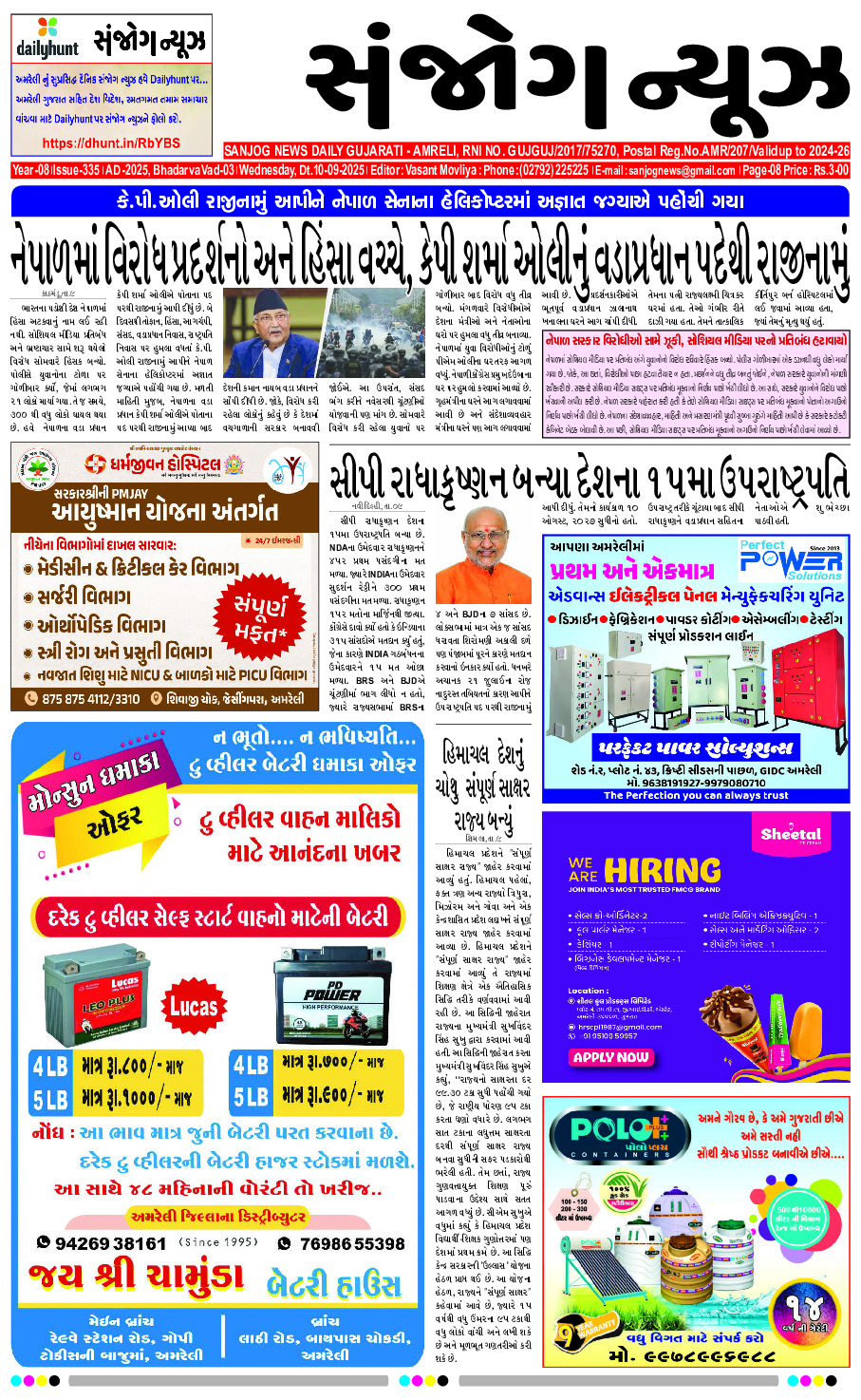 Home ઇપેપેર E-paper 10-09-2025 ઇપેપેર E-paper 10-09-2025 By Sanjog News - 10/09/2025 RELATED ARTICLESMORE FROM AUTHOR E-paper 04-03-2026 E-paper 03-03-2026 E-paper 02-03-2026 E- PAPER 01-03-2026 E-paper 28-02-2026 E- PAPER 27-02-2026 E-paper 26-02-2026 E- PAPER 25-02-2026 E -PAPER 24-02-2026 E-paper 22-02-2026 E- PAPER 21-02-2026 E – PAPER 20-02-2026 રાજુલા શહેરની પીએમશ્રી વડનગર-ર પ્રા.શાળામાં રંગોત્સવ કાર્યક્રમ યોજાયો 28/02/2026 સુરતમાંથી ત્રણ લાખથી વધુનું શંકાસ્પદ પનીર ઝડપાયું,એના લોગ પનીરના સ્ટીકર લગાવીને... 05/03/2026 ‘કનપ્પા’ સ્ટાર વિષ્ણુ મંચુ દુબઈમાં ફસાયા, આકાશમાંથી મિસાઇલોનો વરસાદ, પરિવાર હચમચી... 01/03/2026 ટ્રમ્પે એન્થ્રોપિકને દરવાજા બતાવ્યો, સેમ ઓલ્ટમેનનું ઓપનએઆઈ પેન્ટાગોનમાં પ્રવેશ્યું 28/02/2026 હાર બાદ એઇડન માર્કરામે પોતાનું દુઃખ વ્યક્ત કર્યું, કારમી હારને મોઢા... 05/03/2026 જુનાગઢ કોર્ટે સગીરા સાથે દુષ્કર્મના આરોપીને છ મહિનાની સખત કેદની સજા... 01/03/2026 દામનગર શહેરમાં રામરાજય સોસાયટીમાંથી ૬ જુગારી ઝડપાયા 03/03/2026 નકલી દૂધ વેચવાનો આક્ષેપ ઃ મિલીભગતથી કૌભાંડ ચાલતું હોવાનો કોંગ્રેસનો આરોપ 05/03/2026 રાઘોપુરમાં મહિલાની ક્રૂરતાપૂર્વક હત્યા, આંખો કાઢી નાખવામાં આવી, હાથ તોડી નાખવામાં... 02/03/2026 ખામેનીના મૃત્યુ પછી ઈરાનના આગામી સુપ્રીમ લીડર અરકી બની શકે છે 01/03/2026