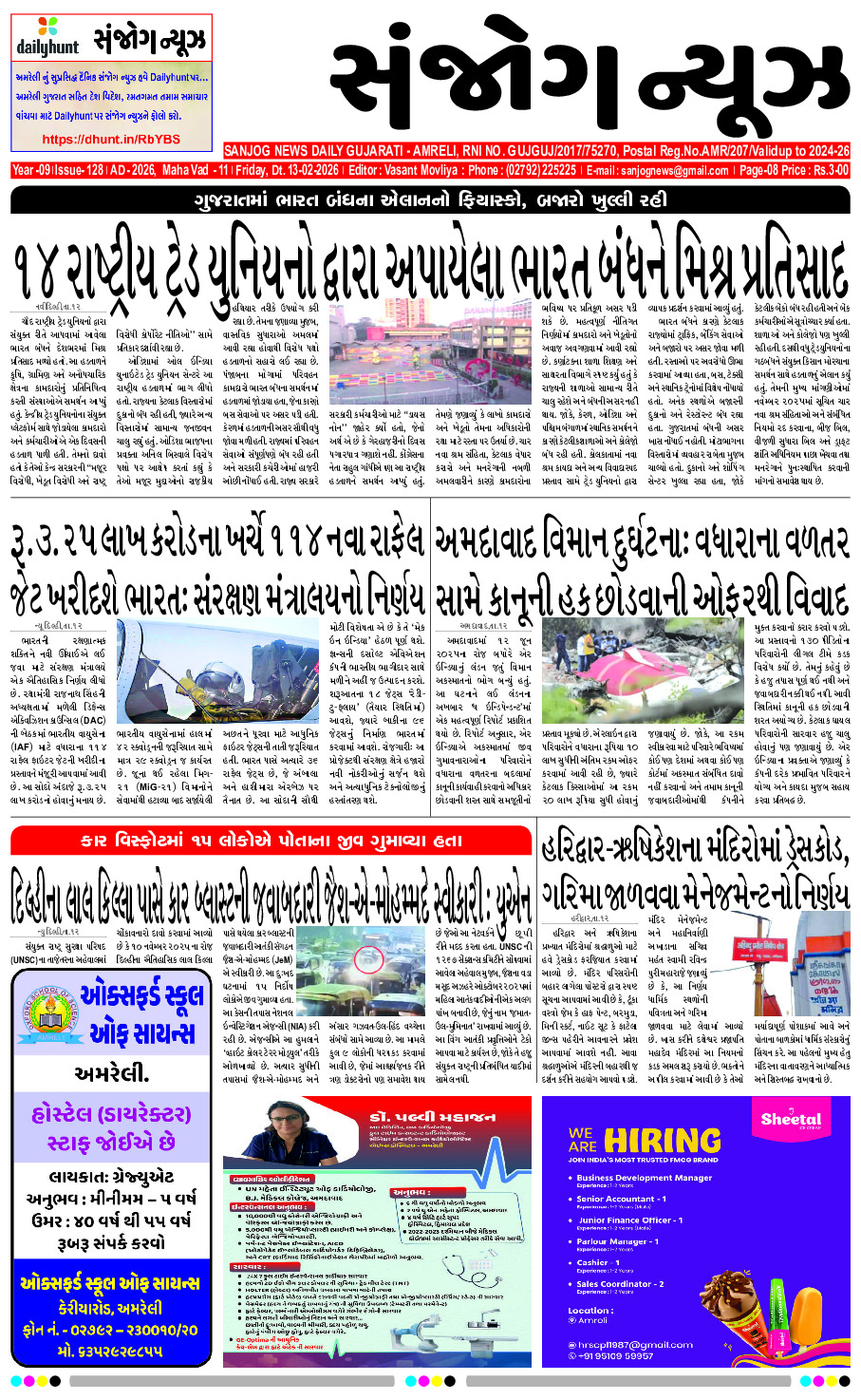 Home ઇપેપેર E- PAPER 13-02-2026 ઇપેપેર E- PAPER 13-02-2026 By Sanjog News - 13/02/2026 RELATED ARTICLESMORE FROM AUTHOR E- PAPER 14-02-2026 E-paper 12-02-2026 E- PAPER 11-02-2026 E – PAPER 10-02-2026 E-paper 09-02-2026 E-paper 08-02-2026 E-paper 06-02-2026 E – PAPER 05-02-2026 E- PAPER 04-02-2026 E- PAPER 03-02-2026 E-paper 02-02-2026 E- PAPER 01-02-2026 અમરેલીમાં બાર કાઉન્સિલ ઉમેદવાર દિલીપભાઈ પટેલનો ચૂંટણી પ્રચાર 10/02/2026 રાજુલા ડેપો મેનેજરની મનમાનીથી જાફરાબાદના મુસાફરોને ભારે હાલાકી 11/02/2026 અમે ક્રિકેટ માટે મેદાનમાં પરસેવો વહાવ્યો છે, એસી રૂમમાં બેસી નથી... 12/02/2026 રાહુલ ગાંધીની નીતિ જૂઠું બોલીને ગેરમાર્ગે દોરવાની છે; જનતા પહેલાથી જ... 14/02/2026 નરવણેનું પુસ્તક પ્રકાશિત થયું નથી, બજારમાં ઉપલબ્ધ નકલો ગેરકાયદેસર છે,પેંગ્વીન 10/02/2026 કોડીનારના સેઢાયા ગામની કરાટે ખેલાડીનું સરપંચ સંઘના પ્રમુખ દ્વારા સન્માન 12/02/2026 વિવિધ કર્મચારી સંગઠનોએ તેમની માંગણીઓ પર દબાણ લાવવા માટે આજે ભારત... 11/02/2026 અમદાવાદના નરોડા વિસ્તારમાં ક્રાઈમ બ્રાન્ચે ડુંગળીની આડમાં છુપાવેલા ૪૦૦ કિલો ગાંજાની... 14/02/2026 સા.કુંડલા માર્કેટયાર્ડમાં સિઝનના નવા જીરુની આવક શરૂ 12/02/2026 11/02/2026