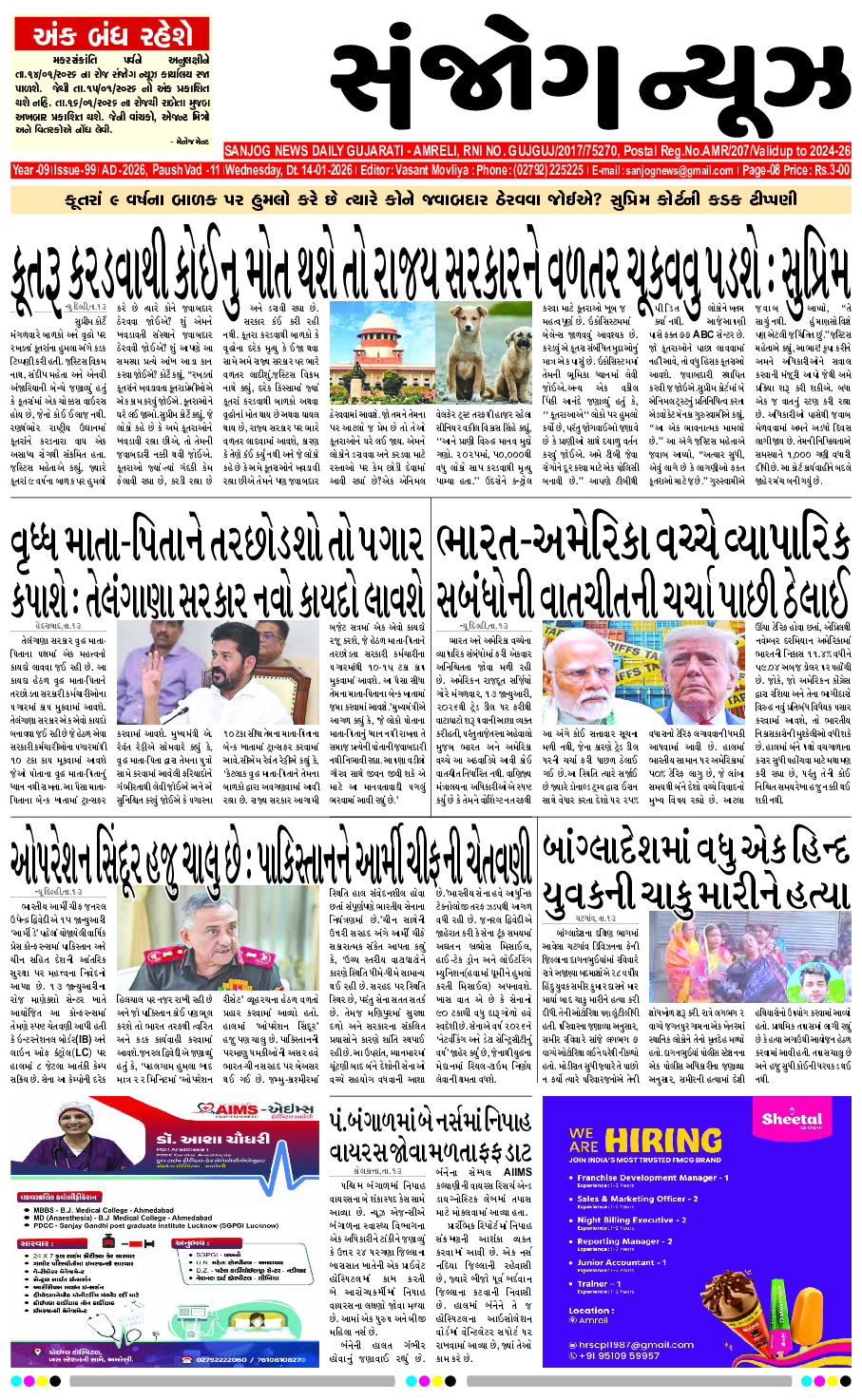 Home ઇપેપેર E- PAPER 14-01-2026 ઇપેપેર E- PAPER 14-01-2026 By Sanjog News - 14/01/2026 RELATED ARTICLESMORE FROM AUTHOR E- PAPER 16-01-2026 E-paper 13-01-2026 E- PAPER 12-01-2026 E-paper 11-01-2026 E-paper 10-01-2026 E -PAPER 09-01-2026 E- PAPER 08-01-2026 E-paper 07-01-2026 E-paper 06-01-2026 E-paper 05-01-2026 E-PAPER 04-01-2026 E-paper 03-01-2026 બાબરાના કોટડાપીઠા પાસે હિટ એન્ડ રનઃ અજાણ્યા વાહનની અડફેટે પુરુષનું મોત 16/01/2026 નવસારી નજીક ડ્રગ્સના જથ્થા સાથે બે લાખનો મુદ્દામાલ કબજે, ૩ આરોપી... 15/01/2026 ભાજપે શીખ સમુદાયની ભાવનાઓને ઠેસ પહોંચાડી, સંજય સિંહે મોદી-શાહ પર નિશાન... 11/01/2026 બાબરાના વલારડી ગામે ઝેરી દવા પીવાથી આધેડનું મોત 10/01/2026 સાવરકુંડલાની પરિણીતાને શારીરિક-માનસિક ત્રાસ આપી ઘરમાંથી કાઢી મૂકી 11/01/2026 ગુજરાતમાં આરઆઇએલ ૫ વર્ષમાં ૭ લાખ કરોડ રૂપિયાનું રોકાણ કરશે,મુકેશ અંબાણી 11/01/2026 અન્ય જિલ્લાની સાથે સાવરકુંડલામાં પણ સ્માર્ટ જીઆઈડીસી બનશે 12/01/2026 બગસરામાં ઉધાર માવો માંગવા જેવી નજીવી બાબતે દંપતીને માર માર્યો 12/01/2026 રાજુલાની સેન્ટ થોમસ હાઈસ્કૂલમાં વિદ્યાર્થીઓને ટ્રાફિક જાગૃતિ અંગે માહિતગાર કરાયા 13/01/2026 જિલ્લામાંથી ત્રણ પ્યાસી પકડાયા 15/01/2026