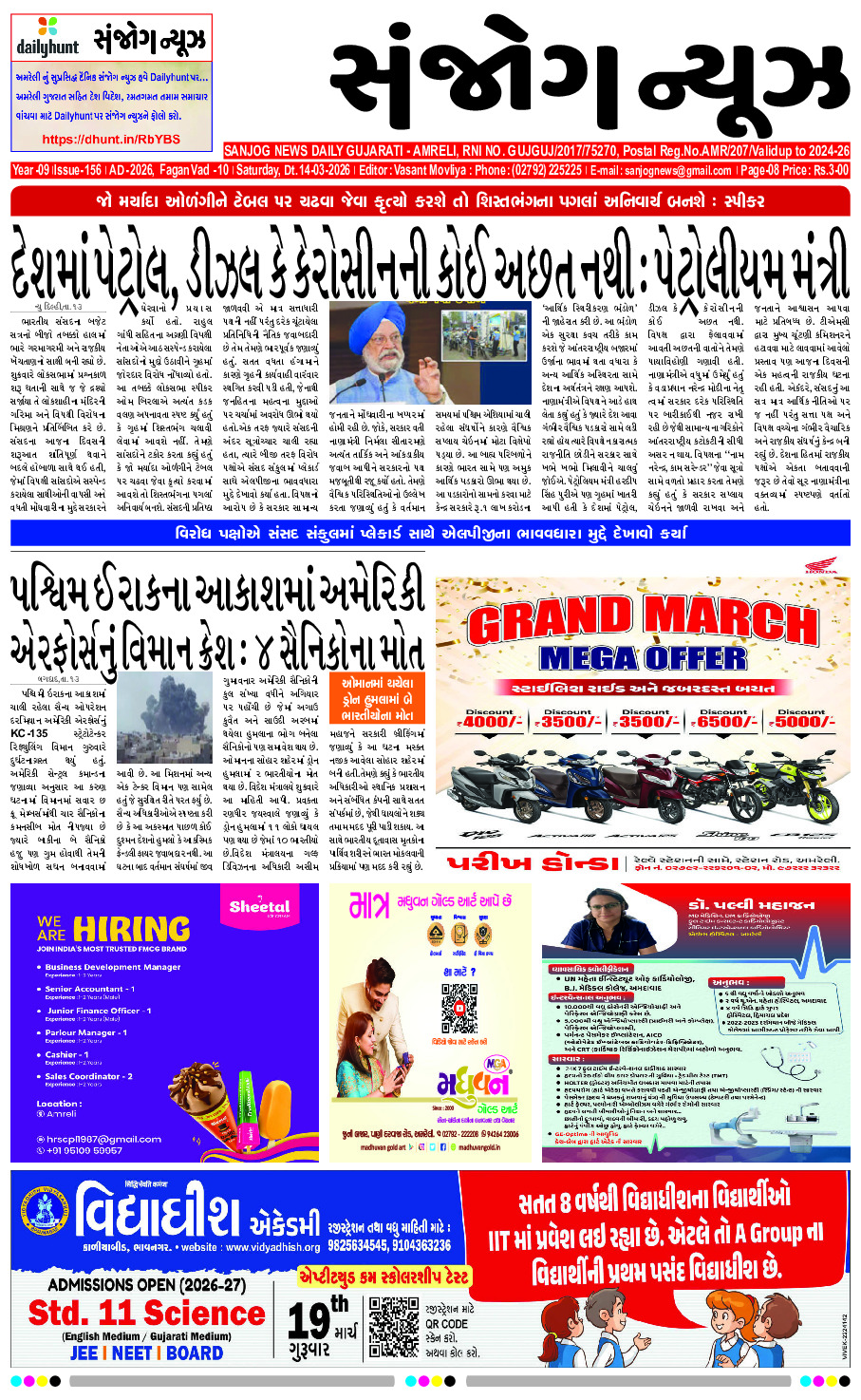 Home ઇપેપેર E-paper 14-03-2026 ઇપેપેર E-paper 14-03-2026 By Sanjog News - 14/03/2026 RELATED ARTICLESMORE FROM AUTHOR કૃતિકા કામરા અને ગૌરવ કપૂરના લગ્નમાં વિરેન્દ્ર સેહવાગ અને યુવરાજ સિંહે જારદાર ડાન્સ કર્યો E- PAPER 13-03-2026 E-paper 12-03-2026 E-paper 11-03-2026 E-Paper 09-03-2026 E- PAPER 08-03-2026 E- PAPER 07-03-2026 E – PAPER 06-03-2026 E-paper 04-03-2026 E-paper 03-03-2026 E-paper 02-03-2026 E- PAPER 01-03-2026 ટીમ ઈન્ડિયા અને ન્યુઝીલેન્ડે ટી ૨૦ વર્લ્ડ કપમાં અત્યાર સુધી કુલ... 07/03/2026 રાજ્યસભામાં નોમિનેશન પછી, શું સમૃદ્ધિ યાત્રા બિહારમાં એક મોટી રમત બનશે... 09/03/2026 મધ્ય પૂર્વમાં યુદ્ધને કારણે ભારતીય બંદરો પર ભારે ભીડ ઊભી થઈ... 07/03/2026 નિધિ અગ્રવાલે બાબા મહાકાલ મંદિરની મુલાકાત લીધી અને અંદર ધ્યાન કર્યું 12/03/2026 મારા શરીરને આખું નિચોવી નાખ્યું…’ફિલ્મ ‘વશ’ની ગુજરાતી અભિનેત્રીએ ખોલ્યા રહસ્યો 10/03/2026 ગજેરા કેમ્પસ-વિદ્યાસભાના જુડો ખેલાડીઓનો રાજ્યકક્ષાના ખેલમહાકુંભમાં દબદબો 13/03/2026 બોર્ડની પરીક્ષા આપવા જતા વિદ્યાર્થીઓને નડ્યો અકસ્માત, બનાસકાંઠામાં બેના તો તાપીમાં... 12/03/2026 આંબરડી સફારી પાર્કમાં સ્થાનિક તેમજ વિદેશી મુસાફરોની સંખ્યા વધતા... 12/03/2026 વડિયાના ભુખલી સાથલી ગામની દિકરી અનેક લોકો માટે પ્રેરણાસ્ત્રોત બની 14/03/2026 જા સિલિન્ડર સરળતાથી ઉપલબ્ધ ન હોય, તો તે લોકો માટે એક... 13/03/2026