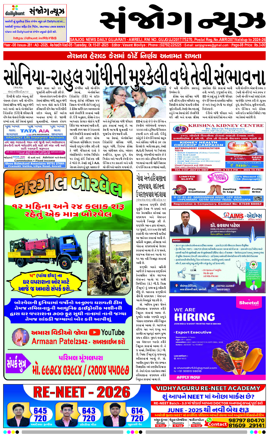 Home ઇપેપેર E – PAPER 15-07-2025 ઇપેપેર E – PAPER 15-07-2025 By Sanjog News - 15/07/2025 RELATED ARTICLESMORE FROM AUTHOR E-paper 21-01-2026 E – PAPER 20-01-2026 E-paper 19-01-2026 E- PAPER 16-01-2026 E- PAPER 14-01-2026 E-paper 13-01-2026 E- PAPER 12-01-2026 E-paper 11-01-2026 E-paper 10-01-2026 E -PAPER 09-01-2026 E- PAPER 08-01-2026 E-paper 07-01-2026 ભાવનગર યુનિવર્સિટીમાં નશાના નિશાન,ગાંજા, ગોગો પેપર અને દારૂની બોટલો મળી આવતા... 20/01/2026 ધોરાજીમાં ૨૫ વર્ષીય યુવાનનું હાર્ટએટેકથી મોત થતા અરેરાટી 20/01/2026 ઈમરાન હાશમીએ અમદાવાદમાં પતંગ મહોત્સવ માણ્યો,ગુજરાત સરકાર અને ગુજરાત ટુરીઝમની પ્રશંસા... 15/01/2026 જૂનાગઢઃ ધાર્મિક સ્થળો પર પ્રાથમિક સુવિધાનો અભાવ, શ્રદ્ધાળુઓમાં તંત્ર સામે રોષનો... 15/01/2026 રાજ્યપાલ અને સરકાર વચ્ચે વિવાદ તમિલનાડુ વિધાનસભાના પહેલા સત્રમાં ભાષણ વાંચ્યા... 20/01/2026 ગ્રીનલેન્ડ માટે કેનેડા અમેરિકા સામે લડશે, વડા પ્રધાન માર્ક કાર્નેએ મોટો... 18/01/2026 જ્યાં સુધી ધર્મ ભારતનું માર્ગદર્શન કરશે, ત્યાં સુધી દેશ વિશ્વ નેતા... 18/01/2026 બીએમસીના નવા મેયર ભાજપ માંથી હશે, શિંદેની પાર્ટીને આ પદ નહીં... 20/01/2026 જામનગરઃ ઉત્તરાયણની રાત્રે જ્વેલર્સની દુકાનમાં બાકોરું પાડી લાખોના દાગીનાની ચોરી 19/01/2026 ગાંધીનગરમાં ટાઈફોઈડનો કહેર! છેલ્લા ૨૪ કલાકમાં નવા ૬ કેસ સાથે કુલ... 15/01/2026
