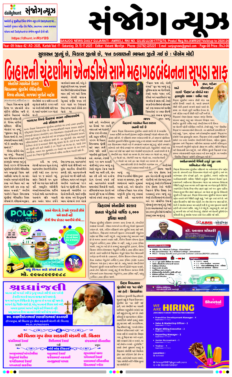 Home ઇપેપેર E-PAPER 15-11-2025 ઇપેપેર E-PAPER 15-11-2025 By Sanjog News - 15/11/2025 RELATED ARTICLESMORE FROM AUTHOR E-paper 18-11-2025 E-paper 17-11-2025 E – PAPER 16-11-2025 E- PAPER 14-11-2025 E- PAPER 13-11-2025 E- PAPER 12-11-2025 E-paper 11-11-2025 E-paper 10-11–2025 E – PAPER 09-11-2025 E-paper 08-11-2025 E-paper 07-11-2025 E- PAPER 06-11-2025 પીકેની પાર્ટીએ મોટો દાવો એનડીએએ બિહારમાં મહિલાઓને ૧૦,૦૦૦ રૂપિયા આપવા... 16/11/2025 ધર્મેન્દ્રને હોસ્પિટલમાંથી રજા, હી-મેનની હવે ઘરે સારવાર કરવામાં આવશે 12/11/2025 નીતિશ કુમારની તબિયત સારી દેખાતી ન હતી, પરંતુ હવે તેઓ સારું... 18/11/2025 ઋષભ પંતની હોશિયારીને કારણે બાવુમા આઉટ થયો, અને તેણે કુલદીપને સલાહ... 14/11/2025 સુરેન્દ્રનગર જિલ્લામાં દેશી દારૂની ભઠ્ઠી ઝડપાઇ,એલસીબીએ પાડ્યા દરોડા 16/11/2025 માફી માગો નહીંતર કાનૂની કાર્યવાહી કરવામાં આવશે, રાજ્યપાલે રાજભવનમાં શસ્ત્ર વિતરણના... 16/11/2025 વન વગડામાં જોવા મળતો “મહુડો” ઔષધિય ગુણોની ખાણ 17/11/2025 મધ્યપ્રદેશમાં આરએસએસ કૂચ પર મુસ્લિમ સમુદાય દ્વારા ફૂલોનો વરસાદ, ‘માથાથી માથા’ની... 16/11/2025 દેવકા માધ્યમિક શાળામાં નોકરી કરતી યુવતીનો ગળાફાંસો ખાઈ આપઘાત 14/11/2025 અભિનેત્રી પાયલ ઘોષ લાલ કિલ્લા વિસ્ફોટમાં મિત્રના મૃત્યુથી શોકમાં 12/11/2025