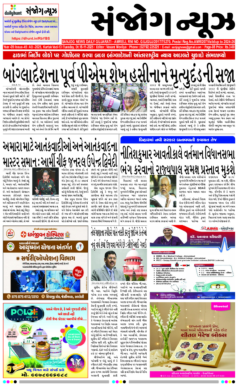 Home ઇપેપેર E-paper 18-11-2025 ઇપેપેર E-paper 18-11-2025 By Sanjog News - 18/11/2025 RELATED ARTICLESMORE FROM AUTHOR E-paper 17-11-2025 E – PAPER 16-11-2025 E-PAPER 15-11-2025 E- PAPER 14-11-2025 E- PAPER 13-11-2025 E- PAPER 12-11-2025 E-paper 11-11-2025 E-paper 10-11–2025 E – PAPER 09-11-2025 E-paper 08-11-2025 E-paper 07-11-2025 E- PAPER 06-11-2025 વડિયાના અરજણસુખ ગામે કુહાડી વડે જીવલેણ હુમલો: વ્યક્તિના બંને પગ કાપી... 12/11/2025 કેન્દ્રિય ગૃહમંત્રી અમિત શાહનો ગુજરાત પ્રવાસ રદઃ વિડીયો કોન્ફરન્સથી મહેસાણાના કાર્યક્રમમાં... 12/11/2025 જૂનાગઢ જેલના પત્રથી રાજકારણ ગરમાયું! ઉનાના ધારાસભ્ય કાળુભાઈ રાઠોડ પર ગંભીર... 12/11/2025 મુંબઈ ઇન્ડિયાયન્સે ગુજરાત ટાઇટન્સમાંથી શેરફેન રધરફોર્ડનો વેપાર કર્યો 14/11/2025 બગોયા ગામે રાજ્યપાલે સાધુ સમાજની મહેમાનગતિ માણી 15/11/2025 જો કોઈ ખેડૂત તરફથી વળતર વિલંબિત મળ્યું હોવાની ફરિયાદ મળશે તો... 16/11/2025 અભિનેતા ગોવિંદા ઘરમાં અચાનક બેભાન થઈ ગયા , હોસ્પિટલમાં દાખલ 12/11/2025 કોડીનારની જવાહર નવોદય વિદ્યાલયના વિદ્યાર્થીઓ રાષ્ટ્રીય ‘કલાઉત્સવ’માં ભાગ લેશે 14/11/2025 જૂનાગઢમાં ૨ કાશ્મીરીઓ,ભુજ હોટેલમાં કાશ્મીરી પરિવારને લઈ ગયું એસઓજી 13/11/2025 અમદાવાદમાં કાચબાની હેરાફેરીનો પર્દાફાશ, ૪ સભ્યો ૧૦ સુરજ કાચબાસહિત કરાઇ ધરપકડ 14/11/2025