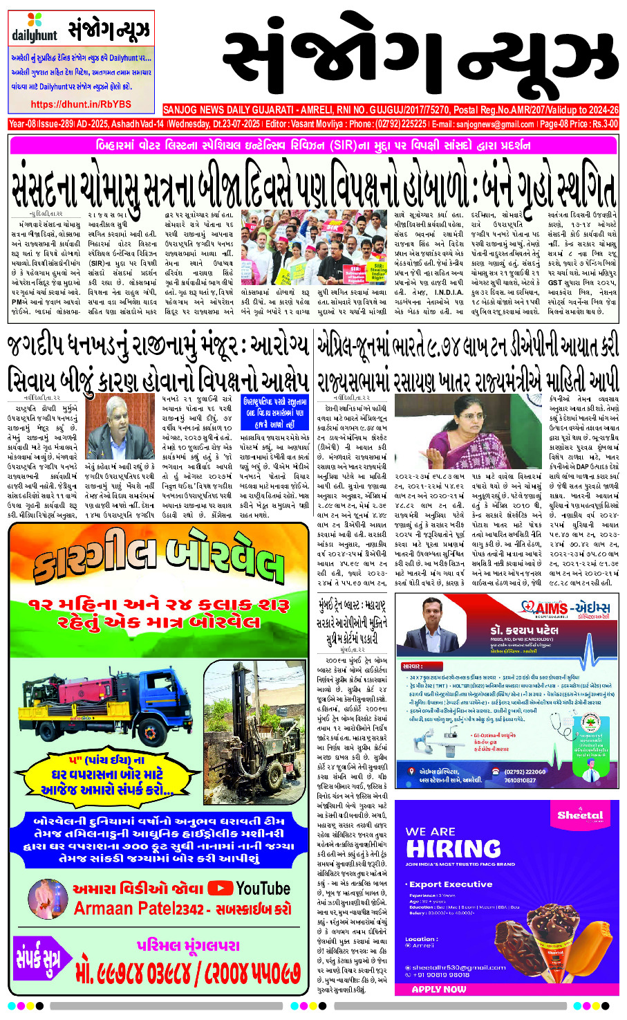Home ઇપેપેર E- PAPER 23-07-2025 ઇપેપેર E- PAPER 23-07-2025 By Sanjog News - 23/07/2025 RELATED ARTICLESMORE FROM AUTHOR E-Paper 14-04-2026 E-PAPER 13-04-2026 E-Paper 12-04-2026 E-Paper 11-04-2026 E-Paper 10-04-2026 E-PAPER 09-04-2026 E- PAPER 08-04-2026 E-PAPER 07-04-2026 E-PAPER 06-04-2026 E-Paper 05-04-2026 E- PAPER 04-04-2026 E- PAPER 03-04-2026 E-Paper 11-04-2026 11/04/2026 ભુજમાં સેવાભાવી વૃદ્ધની ઘરમાં જ હત્યા, આરોપીએ ચાર કલાક બાદ આત્મસમર્પણ... 09/04/2026 ધારીના મીઠાપુર ગાયત્રી મંદિર ખાતે આરોગ્ય કેમ્પ યોજાયો 11/04/2026 10/04/2026 ગુજરાતીઓ આકરી ગરમી માટે તૈયાર રહેજા , હવે આકાશમાંથી અગ્નિ વરસશે 14/04/2026 વૈભવ સૂર્યવંશીના વિસ્ફોટક નોકઆઉટથી બધા સ્તબ્ધ થઈ ગયા, હાર્દિક પંડ્યા પણ... 08/04/2026 11/04/2026 ઓઢવ વિસ્તારમાંથી ઝારખંડની હાઈટેક ગેંગના બે સાગરીતોને ૨૧ કિંમતી મોબાઈલ ફોન... 09/04/2026 10/04/2026 સુરત ડાયમંડ બુર્સ રફ હીરાનું વૈશ્વિક મુખ્ય મથક બનશે 09/04/2026