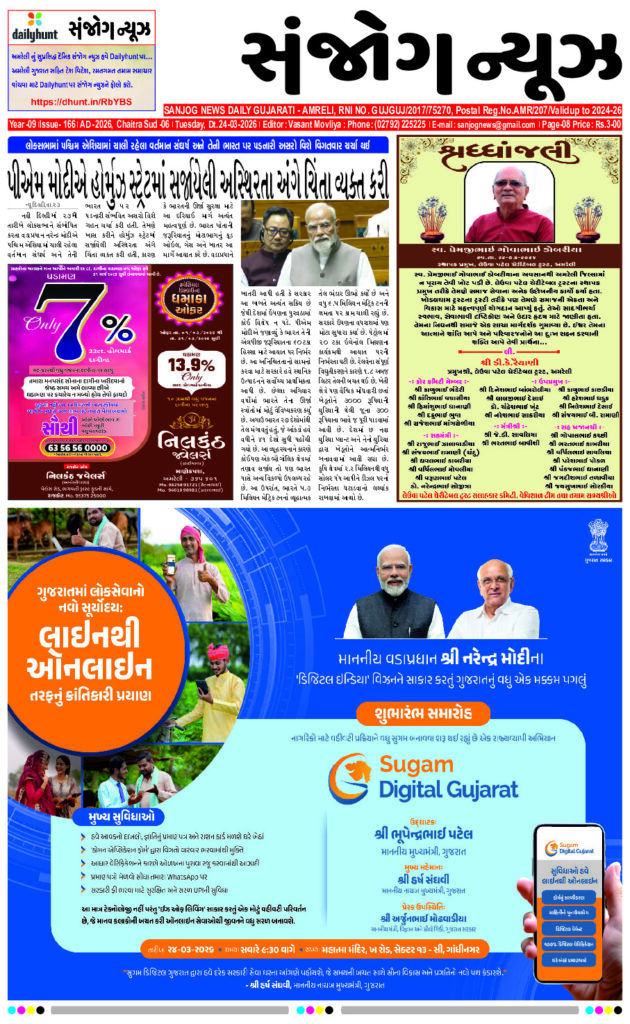 Home ઇપેપેર E-paper 24-03-2026 ઇપેપેર E-paper 24-03-2026 By Sanjog News - 24/03/2026 RELATED ARTICLESMORE FROM AUTHOR E Paper 26.03.2026 E- PAPER 26-03-2026 E-paper 25-03-2026 E- PAPER 23-03-2026 E-paper 22-03-2026 E- PAPER 21-03-2026 E-paper 20-03-2026 E-paper 19-03-2026 E- PAPER 18-03-2026 E- PAPER 17-03-2026 E- PAPER 17-03-2026 E- PAPER 16-03-2026 પત્રકાર સંઘને મળી સફળતા : ધારીમાં લાયબ્રેરી શરૂ થશે 24/03/2026 હરમડિયામાં રેલવે આંદોલનનો સુખદ અંતઃ કેબિનેટ મંત્રી પ્રદ્યુમન વાજાએ કરાવ્યા પારણા 23/03/2026 અમરેલીમાં રૂ.ર૭૦ કરોડના ખર્ચે બનનાર બાયપાસ રોડનું મુખ્ય મંત્રીના હસ્તે ખાતમુહૂર્ત 23/03/2026 અમદાવાદના શાંતિગ્રામ સ્થિત સ્વામિનારાયણ ગુરુકુલમાં પ્રથમ ‘વાલી ઓરિએન્ટેશન’ અને ‘વિશ્વશાંતિ પ્રાર્થના... 25/03/2026 બિહાર દિવસઃ મુંબઈમાં ભારે હોબાળા વચ્ચે બાળાસાહેબ ઠાકરેએ નીતિશ કુમારને વિકાસ... 22/03/2026 મધ્ય પૂર્વ યુદ્ધ વચ્ચે રાજનાથ સિંહે ઉચ્ચ સ્તરીય બેઠક યોજી ,... 24/03/2026 રોહિત શેટ્ટીના ઘરે ફાયરિંગ કેસમાં પોલીસે મોટી સફળતા મેળવી, યુપીમાં ૧૪મા... 22/03/2026 વિશ્વ જળ દિવસ,પીએમ મોદીએ પાણીને જીવનનો પાયો ગણાવ્યું અને સંરક્ષણનો સંદેશ... 22/03/2026 અમરેલી જિલ્લામાં ઈદની ઉજવણી કરાઈ 22/03/2026 ગીરગઢડામાં સિંહણનો ‘સુપર જમ્પ’ : ભારેખમ મારણ સાથે વાડીનો ઊંચો ગેટ... 26/03/2026