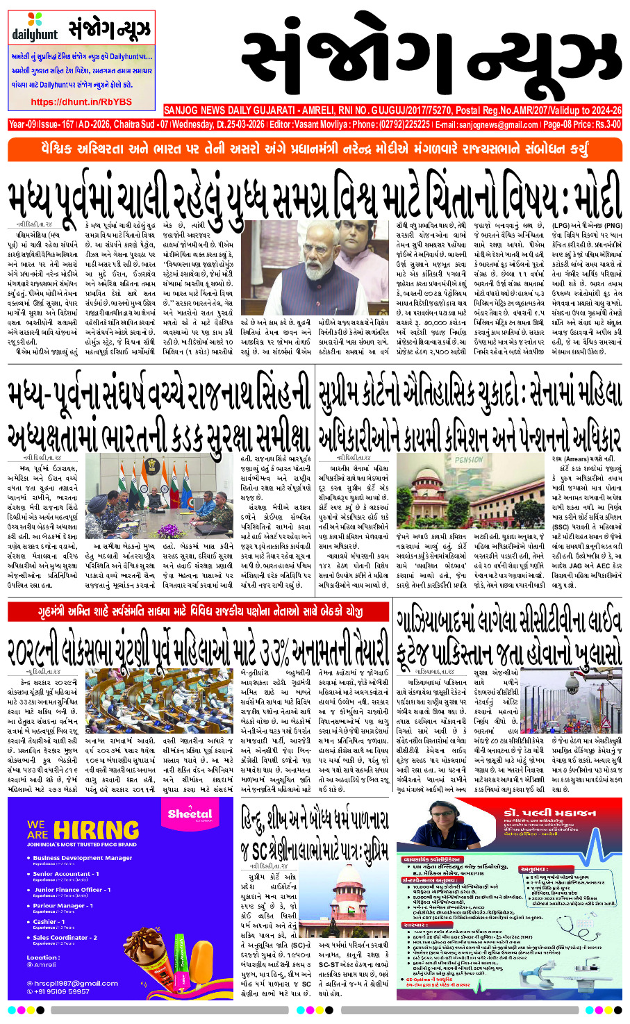 Home ઇપેપેર E-paper 25-03-2026 ઇપેપેર E-paper 25-03-2026 By Sanjog News - 25/03/2026 RELATED ARTICLESMORE FROM AUTHOR E Paper 26.03.2026 E- PAPER 26-03-2026 E-paper 24-03-2026 E- PAPER 23-03-2026 E-paper 22-03-2026 E- PAPER 21-03-2026 E-paper 20-03-2026 E-paper 19-03-2026 E- PAPER 18-03-2026 E- PAPER 17-03-2026 E- PAPER 17-03-2026 E- PAPER 16-03-2026 ધુરંધર ૨ ના દિગ્દર્શક આદિત્ય ધરે ફિલ્મની ભવ્ય સફળતા પર ખુશી... 21/03/2026 લેઉવા પટેલ ચેરીટેબલ ટ્રસ્ટ દ્વારા અમરેલીમાં આજે સ્વ.પ્રેમજીભાઈ ડોબરીયાને શ્રદ્ધાંજલિ... 24/03/2026 જેમ્સ નીશમ પ્રથમ વખત ટી૨૦ આઈમાં ન્યુઝીલેન્ડનું નેતૃત્વ કરશે,ટીમ ટી ટવેન્ટી... 22/03/2026 ‘ધુરંધર ૨’ જાઈ રહેલા ગુસ્સે ભરાયેલા દર્શકોએ સ્ક્રીન તોડી નાખી,કેનેડિયન થિયેટરમાં... 22/03/2026 સુરેન્દ્રનગર જિલ્લાની ૨૭૧૦ જેટલી આંગણવાડીમાં ફરજ બજાવતી બહેનો હડતાલ ઉપર ઉતરી 20/03/2026 બાબરાના ઘુઘરાળા ગામના પાટીયા પાસે અકસ્માતમાં એકનું મોત 24/03/2026 લેઉવા પટેલ ચેરીટેબલ ટ્રસ્ટ અમરેલી દ્વારા સ્વ.પ્રેમજીભાઈ ડોબરીયાને શ્રદ્ધાંજલિ અર્પણ કરાઈ 26/03/2026 સાવરકુંડલા-લીલીયા વિધાનસભામાં માર્ગ સુવિધા માટે રૂ.૧૨.૨૫ કરોડ મંજૂર 26/03/2026 દિગ્વિજય સિંહે રામ નવમી પર અયોધ્યામાં ભગવાન રામ લલ્લાના દર્શન કર્યા 26/03/2026 વીજબીલની બાકી રકમની વસૂલાત કરવા વાડીએ ગયેલા પીજીવીસીએલના કર્મચારીને ધમકી આપી 24/03/2026